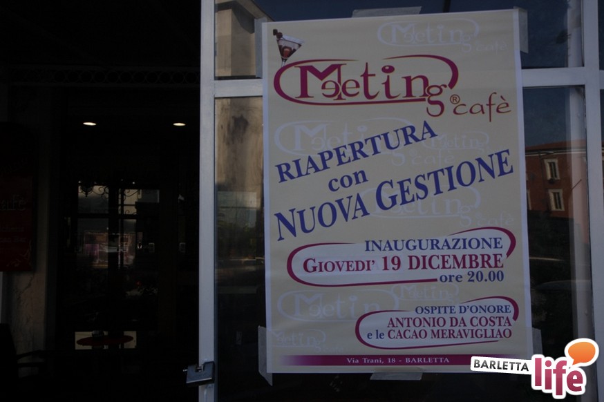 Riapre il Meeting Cafè, tradizionale punto di incontro della movida barlettana. Dopo una chiusura che ha lasciato disorientati i più, ritorna con una nuova gestione uno dei più bei bar della città. Alle porte di Barletta, nelle vicinanze del monumentale Castello Svevo e della parco antistante, il Meeting Cafè è sempre stato considerato e riconosciuto un bellissimo luogo per gustare un cocktail con gli amici, gustosi aperitivi magari accompagnati da uno dei rinomati liquori della più ampia scelta. Una nuova anima per questo bellissimo locale, prevede varie novità. In primis un barman fisso a disposizione degli avventori, gli inimitabili cornetti caldi a colazione e di notte assieme al ben noto servizio di caffetteria (caffè Rosito, ma con una miscela scelta ed approvata dalla nuova gestione del Meeting Cafè, attentissima alle esigenze dei palati più fini).Quali allora le novità? Coperto sempre gratuito, in controtendenza rispetto allo standard. Nessun costo nascosto, dunque puoi divertirti senza alcun problema. Confermati i salottini, perfetti come luogo d'incontro per affari o semplice relax.