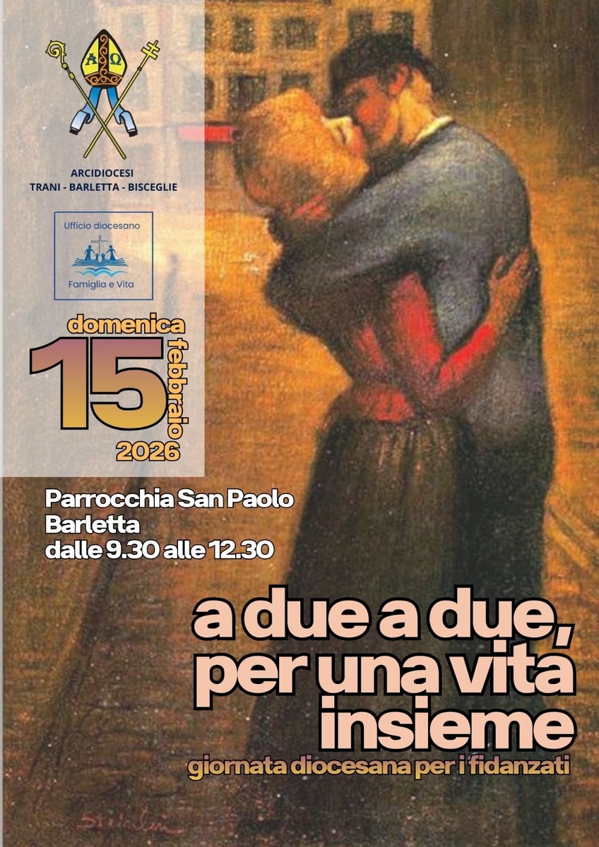 Domenica 15 febbraio 2026 l'Arcidiocesi di Trani-Barletta-Bisceglie, attraverso l'Ufficio diocesano Famiglia e Vita, propone la Giornata diocesana per i fidanzati dal titolo "A due a due, per una vita insieme". L'iniziativa si svolgerà presso la Parrocchia San Paolo di Barletta, dalle ore 9.30 alle 12.30, e si inserisce nel cammino pastorale dedicato all'accompagnamento delle coppie che si preparano al matrimonio.