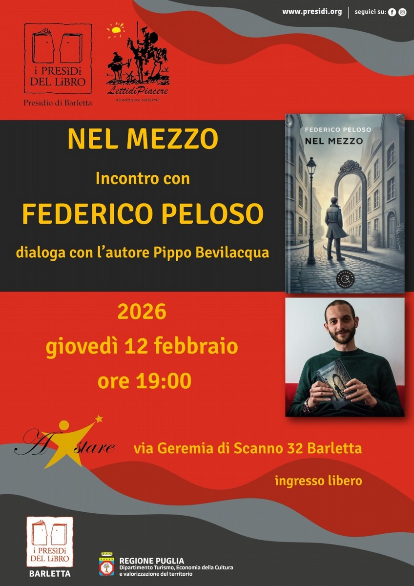Il Presidio del Libro di Barletta e l'Associazione Culturale "LettidiPiacere" presentano: "Nel mezzo" di Federico Peloso. L'autore dialoga con Pippo Bevilacqua. L'evento, è in programma, con ingresso libero, giovedì 12 febbraio 2026 alle ore 19:00 nell'elegante e prestigiosa sede di AStare in via Geremia Di Scanno 32 a Barletta.