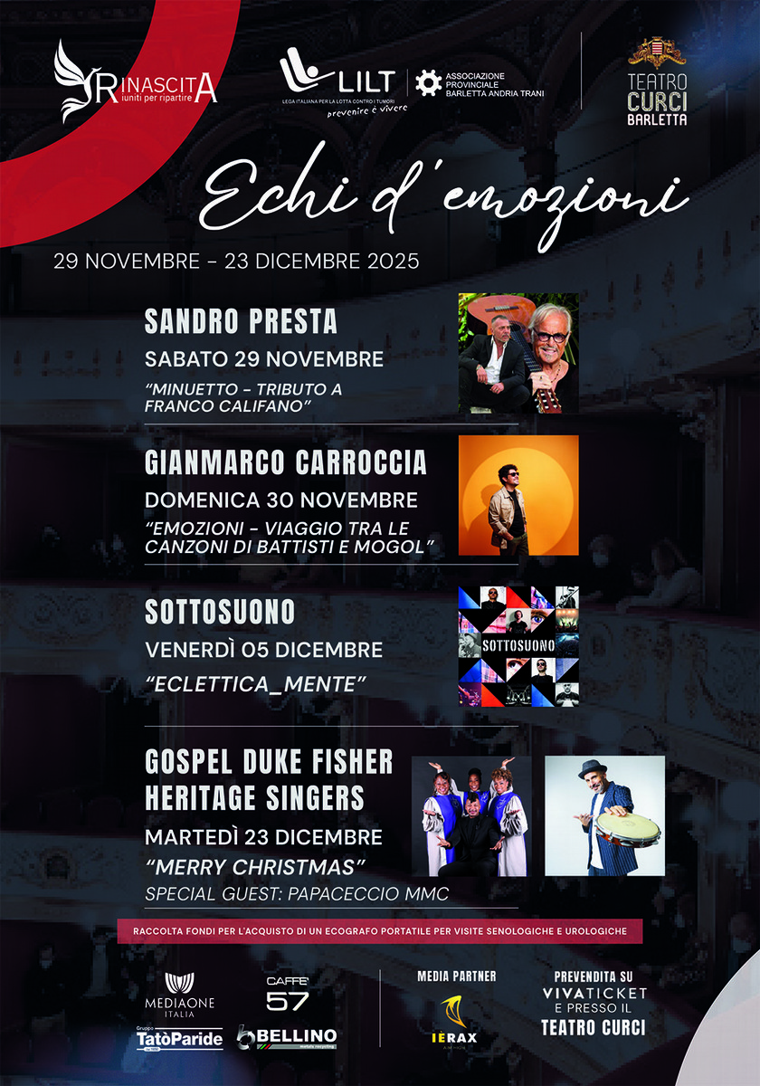 Con "Eco di Emozioni", il Teatro Curci conferma il proprio impegno nella promozione della cultura e delle arti performative, ponendosi come punto di riferimento per la vita culturale della città di Barletta e del territorio pugliese.