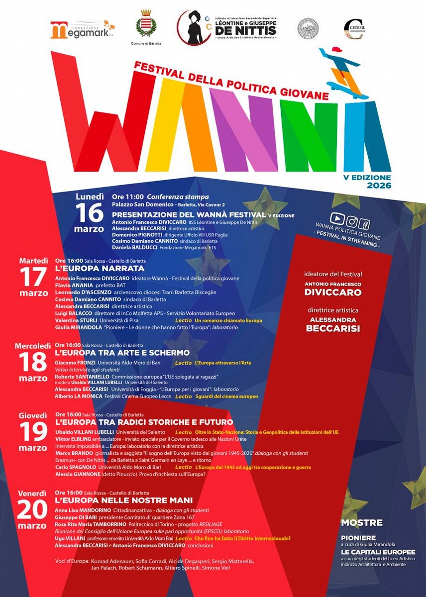 Wannà Festival della politica giovane si arricchisce di un nuovo capitolo e annuncia la sua V edizione. Dal 17 al 20 marzo riparte la rassegna di eventi di organizzata dall'IISS "Léontine e Giuseppe De Nittis" nella Sala Rossa del Castello di Barletta, che pone al centro di quattro intense serate il protagonismo civico di ragazze e ragazzi desiderosi di sensibilizzare la cittadinanza di Barletta ad affrontare i temi del presente con spirito di partecipazione e attivo coinvolgimento.