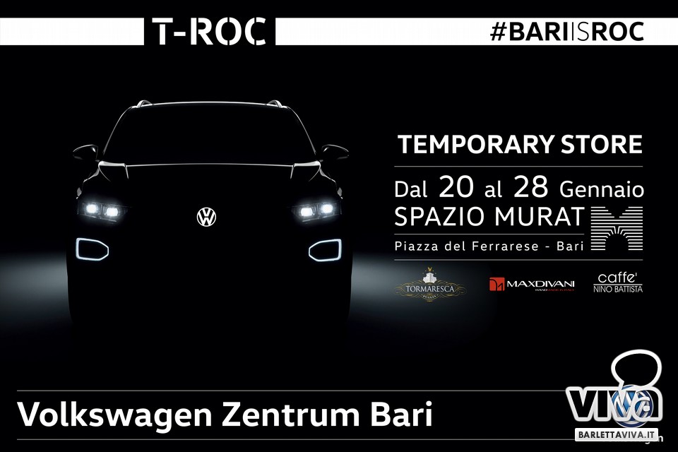 Volkswagen Zentrum Bari per l'attesissimo evento di lancio del primo crossover compatto della gamma Volkswagen, T-Roc, ha scelto di riservare alla propria città un'esperienza esclusiva direttamente nel cuore del centro urbano, allestendo presso lo Spazio Murat un TemporaryStore #BARIisROC dedicato alla presentazione di una nuova auto dal 20 al 28 Gennaio.
