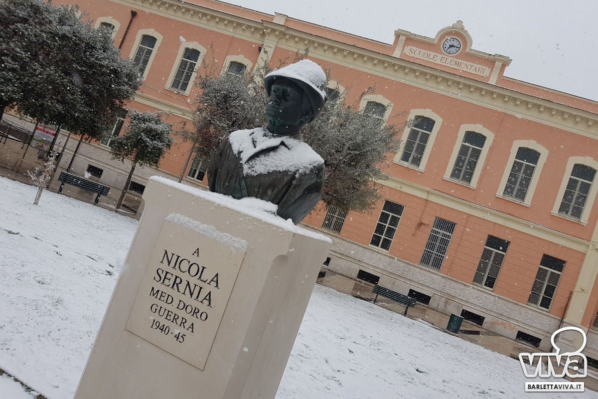 La città di Barletta oggi sembra sospesa, calma e bianca: studenti a casa, strade deserte, in giro solo lavoratori e casalinghe che si spostano lentamente per evitare scivoloni sul ghiaccio. Lo spettacolo della neve ha avvolto la nostra città: se ieri i fiocchi sono scesi troppo lentamente e in serata quasi non ce n'era più traccia, oggi invece la neve è arrivata copiosa riscoprendo finalmente con il suo candidato manto strade, piazze e monumenti.