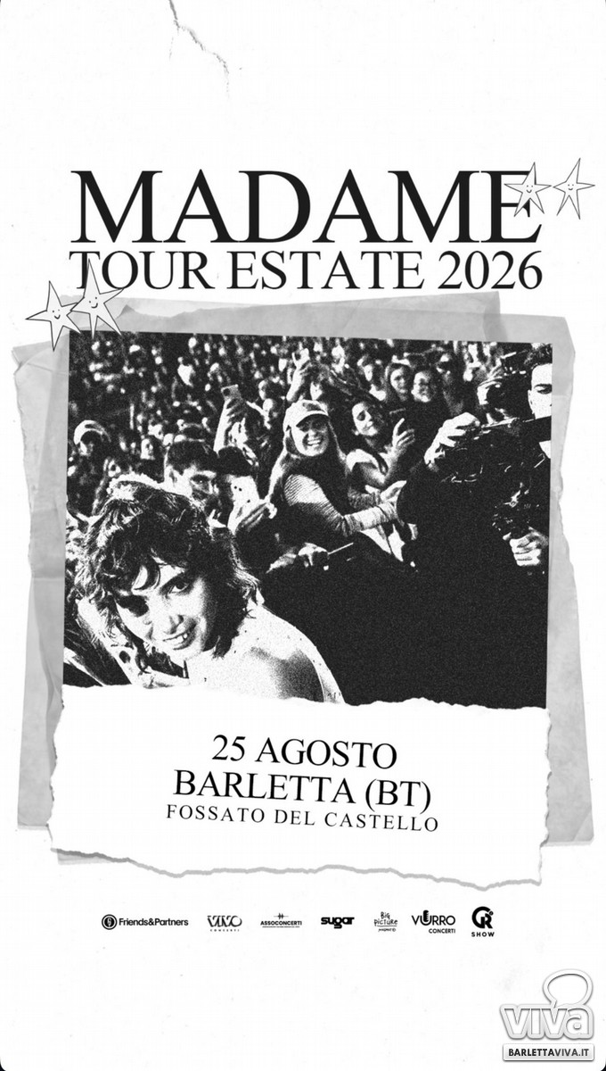 Sarà il Fossato del Castello ad accogliere, il prossimo 25 agosto 2026, la tappa barlettana del tour estivo di Madame. L'annuncio è stato ufficializzato nelle ultime ore, inserendo la città pugliese tra le date della tournée che accompagnerà l'artista nella stagione live del 2026.