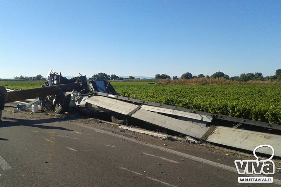 Grande spavento sulla strada statale 16 bis questo pomeriggio: un terribile urto tra un mezzo agricolo e un tir è avvenuto alle 18:15 circa all'altezza del km 737,500, nei pressi dello svincolo per Canne della Battaglia. Nell'impatto il trattore ha perso la parte anteriore, che è stata sballottata lontana sulla carreggiata, mentre il tir è uscito fuori strada, abbattendosi al bordo della corsia che procede da Barletta in direzione Foggia.