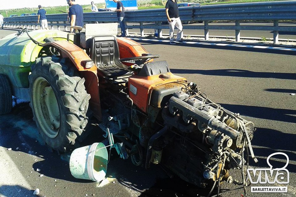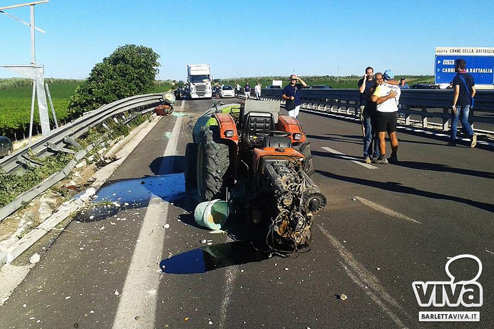 Miracolosamente illesi entrambi i conducenti, solo qualche graffio e un enorme spavento per l'agricoltore a bordo del mezzo agricolo. Inevitabili invece i disagi per la viabilità: traffico bloccato per chi procede verso nord, l'uscita consigliata è quella per Canne della con rientro allo svincolo per Margherita di Savoia, mentre si può viaggiare tranquillamente lungo la corsia sud, fatto salvo qualche rallentamento a causa dei soliti curiosi che stanno rallentando la circolazione.