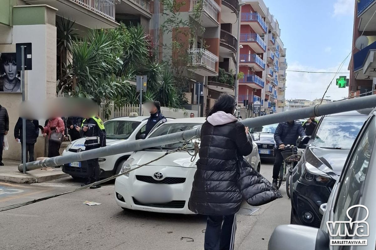 Tragedia sfiorata questa mattina in via Alvisi, a Barletta, dove un'auto in transito è stata colpita da un palo della luce improvvisamente crollato sulla carreggiata. Le cause del cedimento non sono ancora note. Sul posto sono intervenuti gli agenti della Vegapol e i vigili urbani.