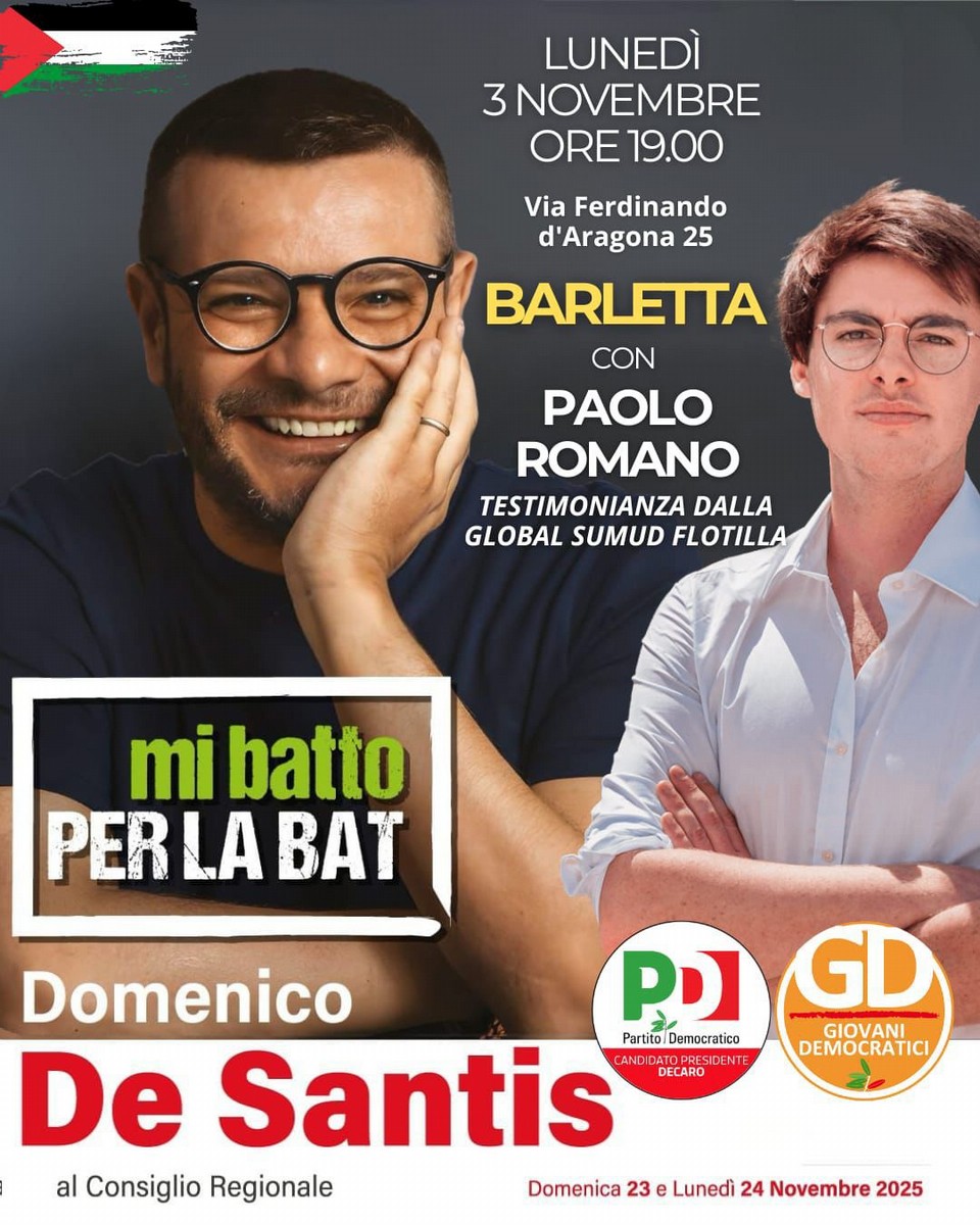 Sarà l'occasione per presentare il suo programma, racchiuso in un impegno, "Mi batto per la Bat", e per incontrare i cittadini e le cittadine. Insieme a Domenico De Santis interverrà anche Paolo Romano, consigliere regionale PD della Lombardia e componente della Sumud Flotilla. Romano, 29 anni, è stato l'ultimo degli esponenti politici italiani a essere stato rilasciato dalle autorità israeliane e fare ritorno in Italia.