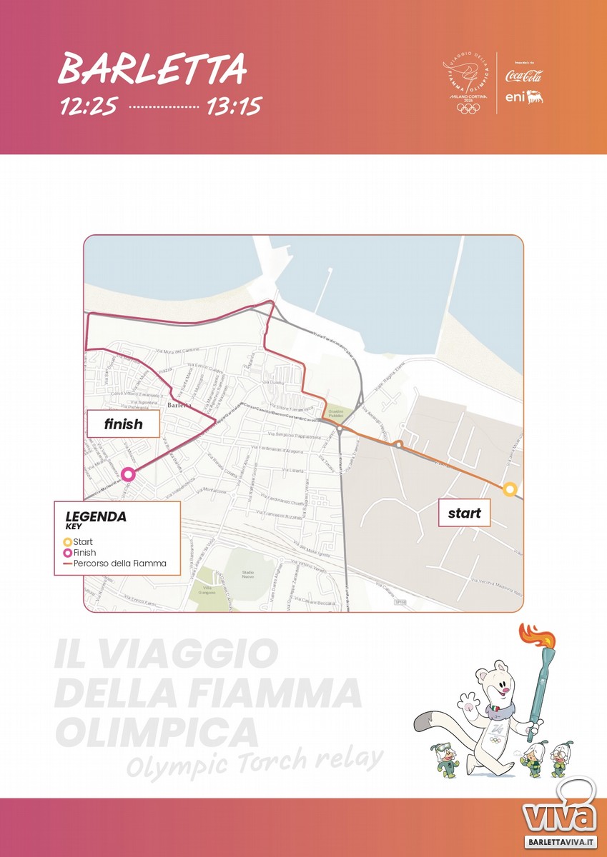 Il 1° gennaio 2026, la Fiamma Olimpica farà il suo ingresso a Barletta. La partenza del primo tedoforo è prevista per le 12:30 circa, da via Trani, all'intersezione con via Misericordia.
