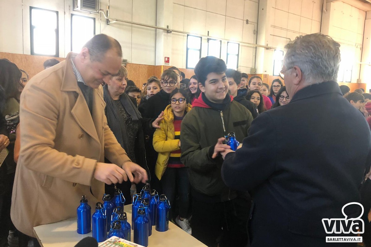 L'iniziativa è stata realizzata dal Comune di Barletta con il contributo della Bar.S.A., la società che si occupa della gestione dei servizi ambientali. I giovani cittadini utilizzeranno le borracce di colore blu al posto delle dannose bottigliette e diventeranno cosi portatori di "educazione e cultura ambientale". La consegna è avvenuta stamane alla presenza, tra gli altri, del sindaco, Cosimo Cannito, dell'assessore all'ambiente, Ruggiero Passero, dell'amministratore unico della Bar.S.A., avv. Michele Cianci, e del preside della scuola, Francesco Messinese.