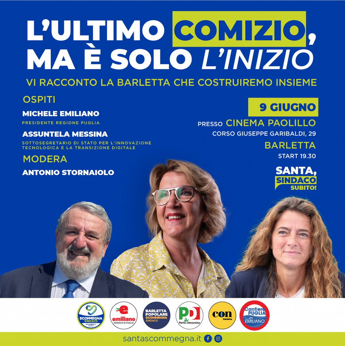Giovedì 9 giugno alle 19.30 nella sala Manfredi del Cinema Paolillo (corso Garibaldi, 29) la candidata sindaco del centro sinistra Santa Scommegna chiuderà la sua entusiasmante campagna elettorale. Insieme al presidente della Regione Puglia Michele Emiliano, al sottosegretario di Stato per l'innovazione tecnologica e la transizione digitale Assuntela Messina e a tutti i sostenitori la candidata racconterà la sua idea di Barletta. Sarà l'occasione per rafforzare lo spirito di comunità alla base del programma, sarà un momento di condivisione, la fine di un percorso e l'inizio di una strada nuova.