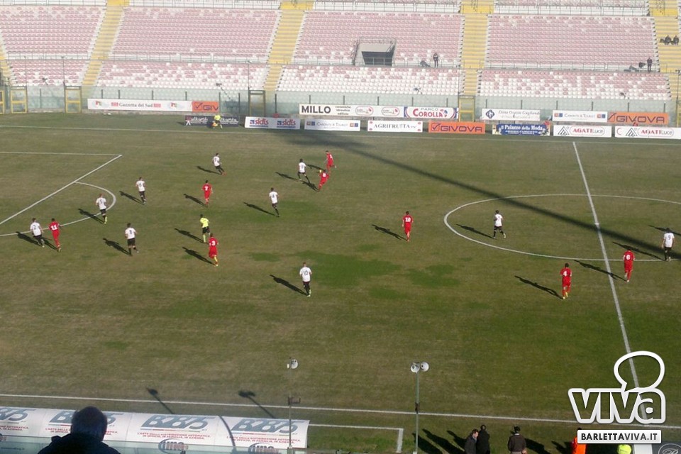 Ritmi piacevoli, con il Messina che prova a pungere l'accoppiata Stendardo-Radi senza esiti e il Barletta che occupa gli spazi con equilibrio, cercando il colpo in ripartenza: ci prova Fall, servito da Venitucci, al 24', ma Iuliano lo frena in uscita. Partita che vive di tatticismi in mediana, e trova il primo "giallo" al 29', con il provvedimento comminato da Mancini a…Mancini. Il Messina prova a colpire su calcio piazzato al 34': sulla sponda di De Bode, Liverani in uscita anticipa bene Corona. Al 37' è il Barletta ad andare a un passo dal vantaggio: ripartenza sull'asse Cortellini-Danti a sinistra, mancino violento dell'attaccante calabrese e prodigiosa respinta in corner di Iuliano. Nel finale di frazione Barletta ancora a un passo dal vantaggio: Cortellini anticipa Donnarumma e chiama Iuliano a sventare il pericolo. E' l'ultima emozione del primo tempo, che si chiude a reti bianche.
