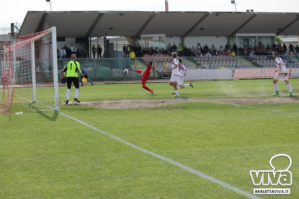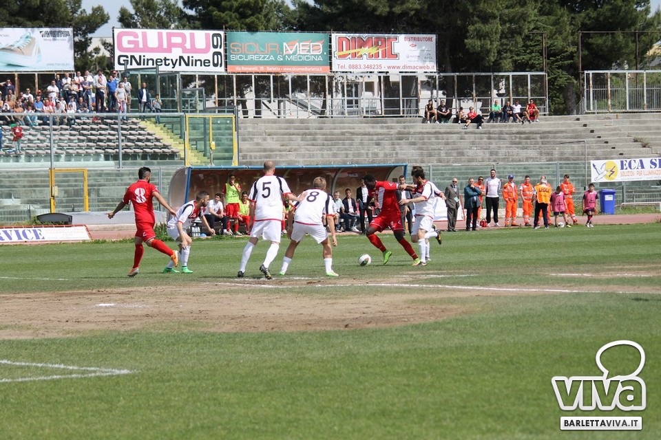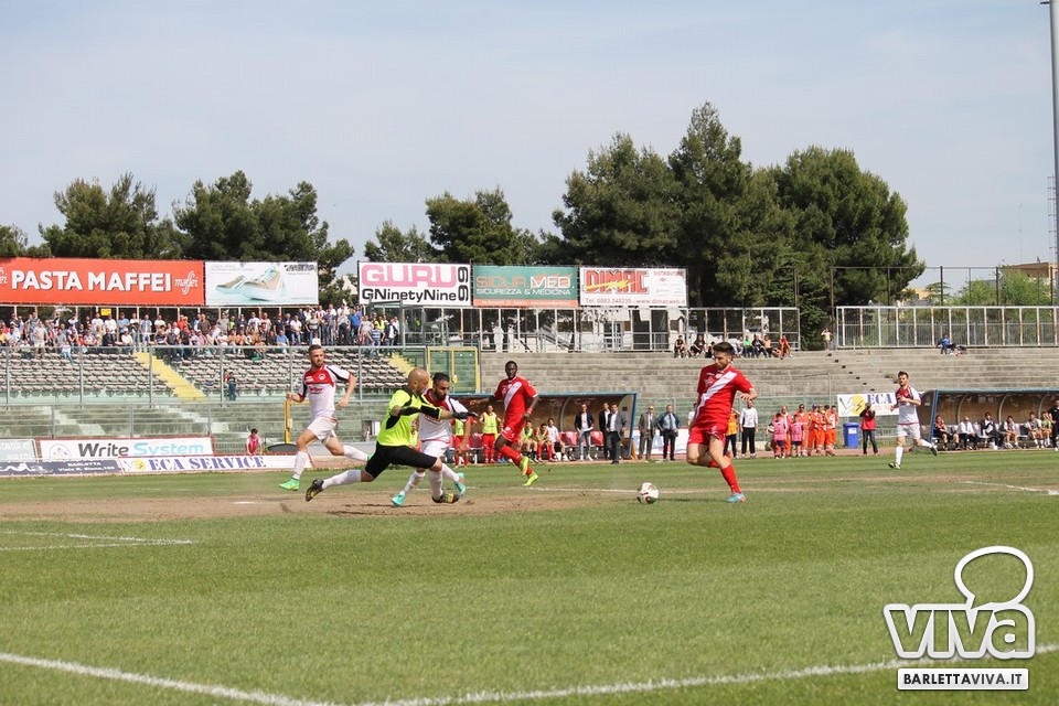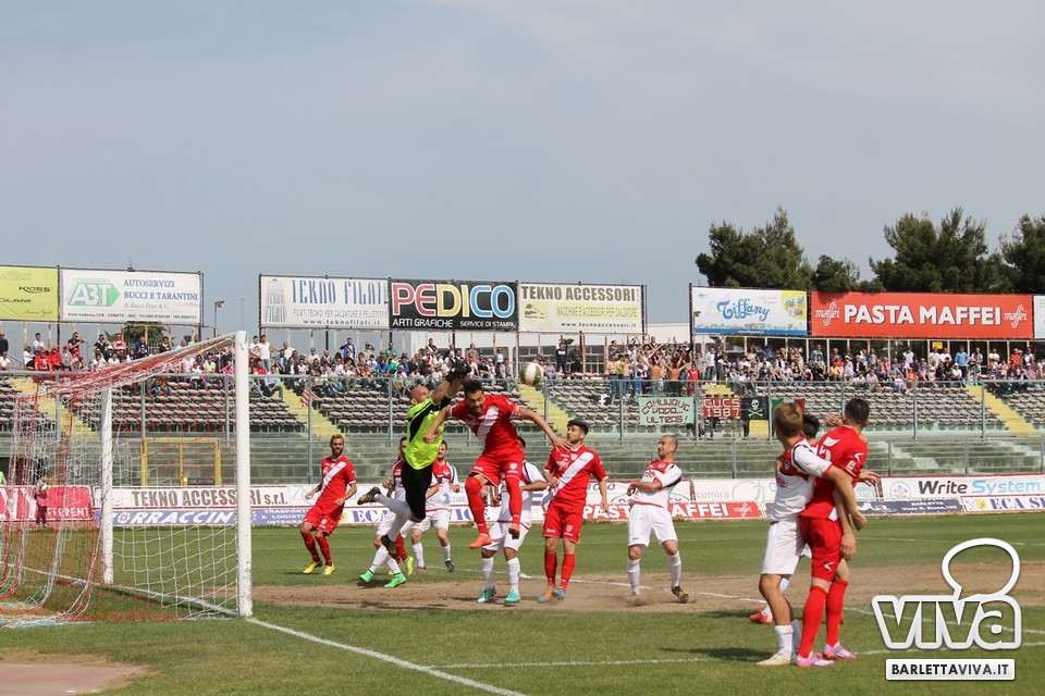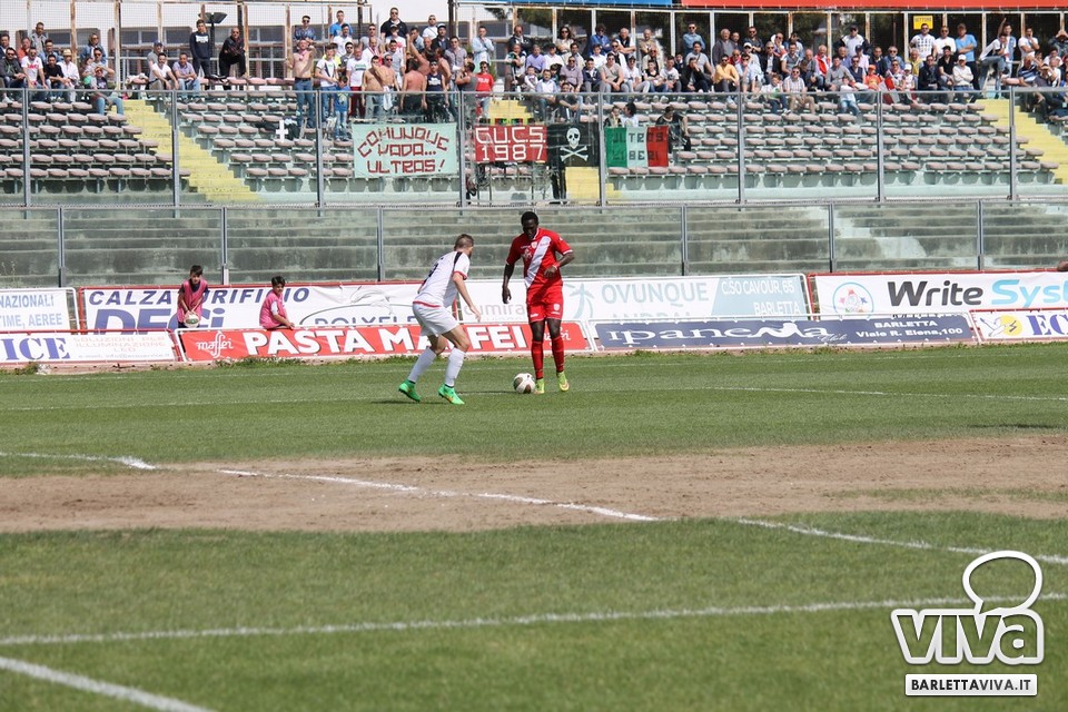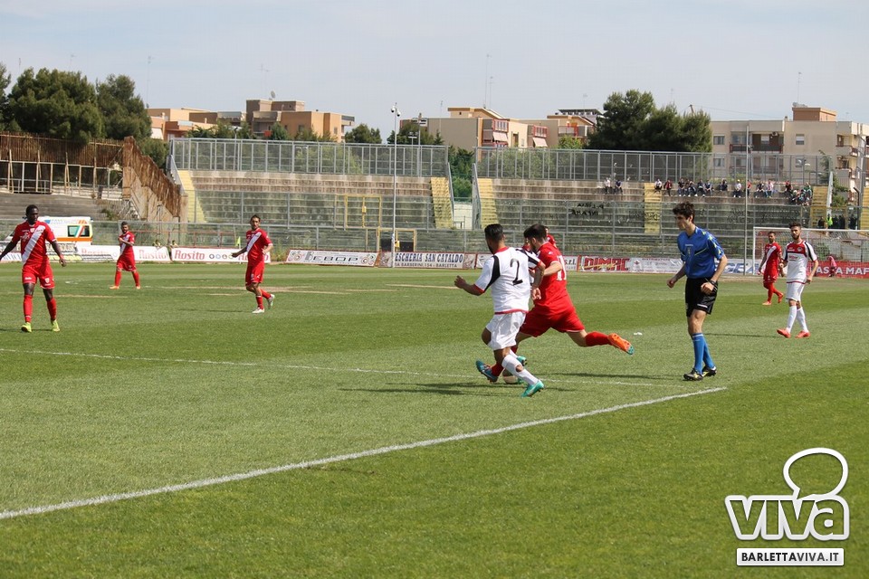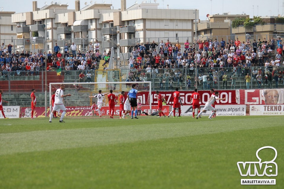 Il derby più atteso dell'anno si è esaurito con una coda amara in casa Barletta Calcio: ieri pomeriggio al "Cosimo Puttilli" è passato il Foggia, con uno 0-1 maturato grazie a un calcio di punizione dai 25 metri realizzato dal mancino di Vincenzo Sarno a 20 minuti dal termine. Dopo un primo tempo avviato con le occasioni capitate a Fall, De Rose e Turchetta da una parte e a Iemmello, Agnelli e Cavallaro su sponda rossonera, la ripresa ha portato in dote un calo di ritmi e tensione, che ha agevolato gli ospiti di mister De Zerbi, abili a portare a casa i tre punti e a legittimare il vantaggio con le occasioni avute da Iemmello e Sicurella. Per il Barletta di Ninni Corda (espulso nel finale dall'arbitro Boggi per proteste) seconda sconfitta consecutiva, che non influisce sulla classifica che oggi recita quota 47 punti ma pesa sulla storia di blasone e tradizione che fa da corollario alla sfida contro i satanelli. In attesa dell'ultimo atto stagionale in quel di Ischia, riviviamo le (poche) emozioni riservate dal derby negli scatti fotografici realizzati e concessi da Giuseppe Savino jr.: