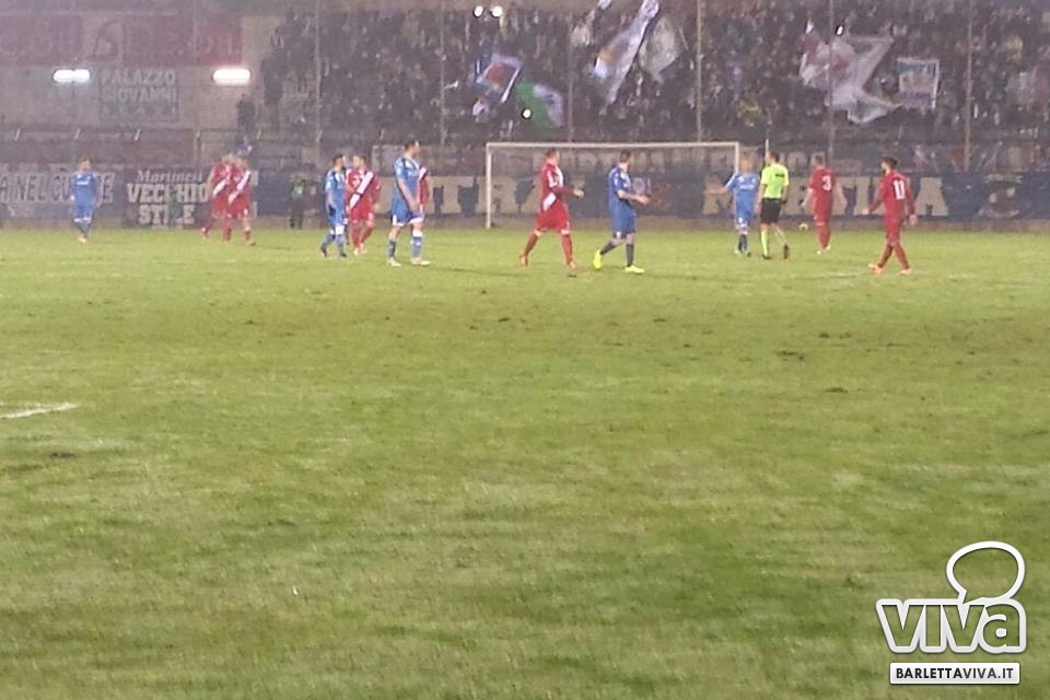Con il passare dei minuti, i padroni di casa alzano il ritmo, seppur esibendo attacchi poco ordinati: al 23' Montalto stacca su cross di Memolla, ma spedisce a lato all'altezza del dischetto. Un minuto e Caruso sferra un potente destro sul primo palo: Liverani risponde presente. Dalla bandierina sponda di Patti per Montalto, stacco a botta sicura e l'estremo difensore biancorosso chiude la porta a chiave. Sulla ripartenza Quadri pennella per Fall: ingresso in area e destro sull'esterno della rete. Al 30' De Giorgi va via a destra, cross al centro dove Caruso va giù: proteste martinesi, Baldicchi lascia correre. Corda richiama Ingretolli per Rizzitelli, Ciullo replica avanzando Fabiano in linea con le quattro punte. Il finale è spigoloso, con il Barletta a congelare la sfera con un sontuoso Quadri e il Martina impegnato nel "prega e lancia in avanti". Nei tre minuti di recupero, i biancorossi serrano le linee, rischiano su un destro di Arcidiacono ma portano a casa tre meritati punti. E la salvezza è lì, a un passo.