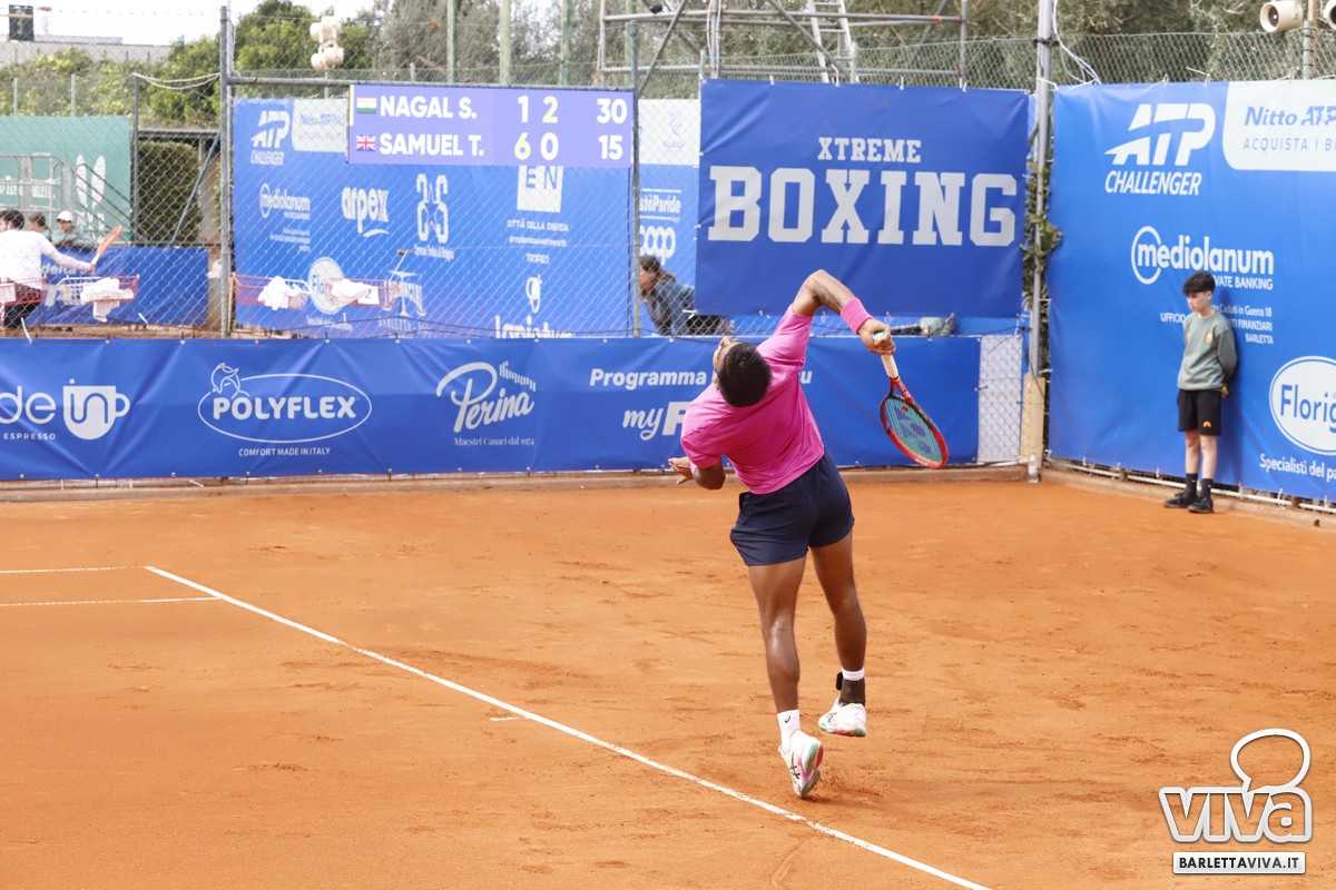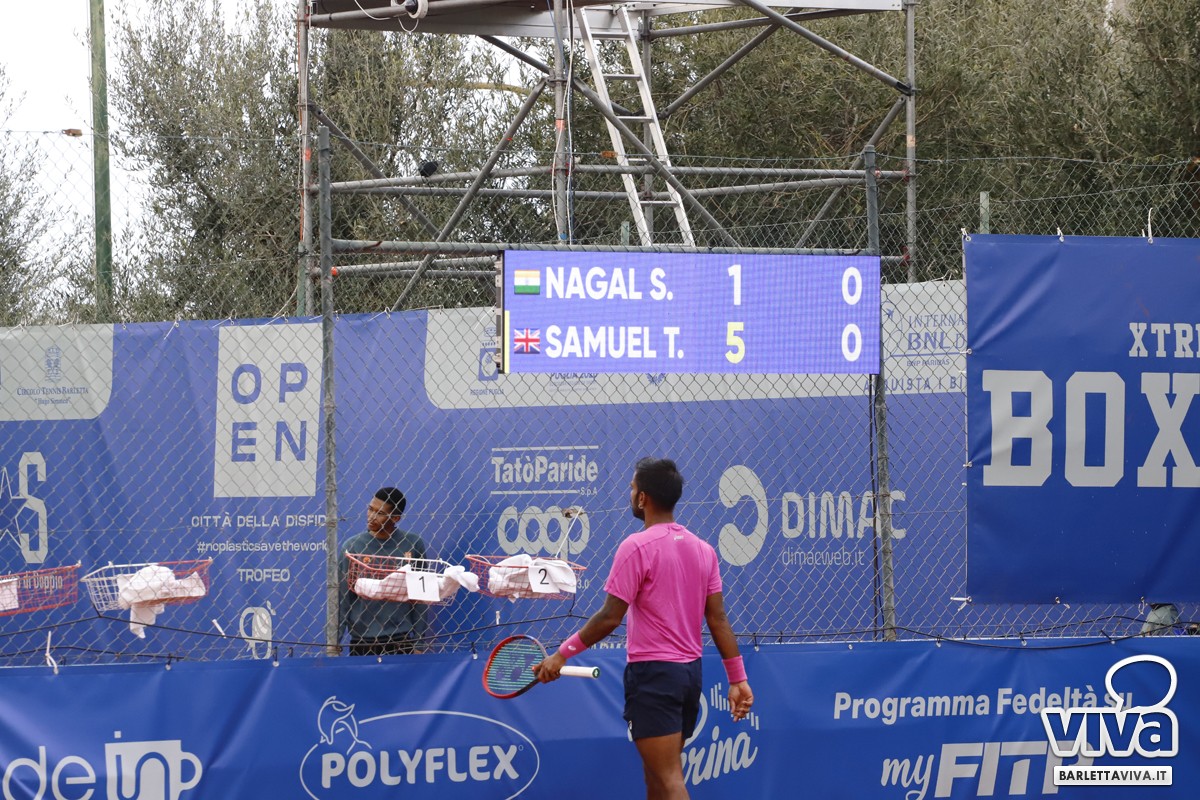 Partito fortissimo, con il break a zero già nel primo gioco, Nagal ha subito il prepotente ritorno di Samuel, il quale ha dapprima immediatamente restituito all'indiano il break del primo gioco, per poi dominare in lungo e in largo la prima partita, chiusasi con un inequivocabile 6-1 a favore del britannico.