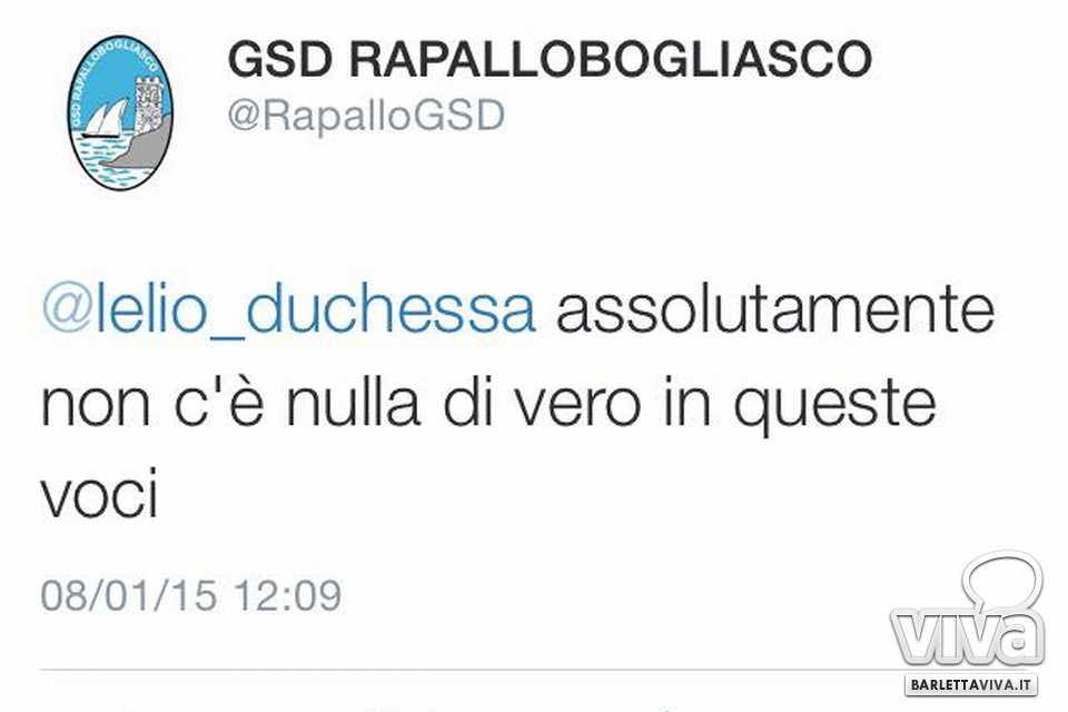 «Se dovesse fallire il Barletta fallirò io, ho dato via il Rapallo Bogliasco per rimanere a Barletta». Le parole sono del presidente biancorosso Giuseppe Perpignano e risalgono alla conferenza tenuta dal numero uno di via Vittorio Veneto il 3 gennaio: ad oggi, di addii al club ligure militante in serie D, non vi è però ufficialità. A darne conferma un tweet del Bogliasco, diffuso in mattinata in risposta al "cinguettio" di un utente che chiedeva lumi sulla vicenda, recitante "assolutamente non c'è nulla di vero in queste voci", aggiungendo che eventuali comunicazioni sarebbero arrivate attraverso il canale ufficiale del club. Probabilmente, ripristinate le macchine della LND dopo la pausa natalizia, il passaggio di quote avverrà a stretto giro di posta.