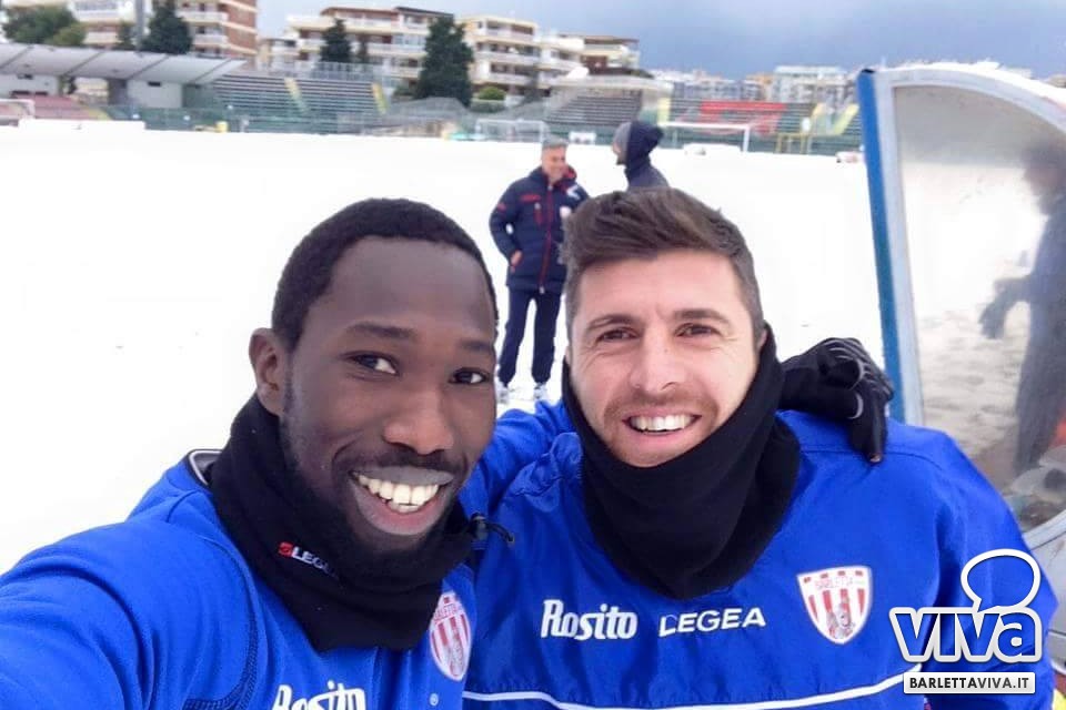 Ultimo dell'anno all'insegna di un breve allenamento e della neve in casa Barletta Calcio (in foto, Stendardo e Fall sorridenti a fine lavori). Oggi il gruppo ha lavorato sul terreno innevato del "Cosimo Puttilli" a sei giorni dalla ripresa del campionato di Lega Pro, girone B, fissata martedì 6 alle 12.30 contro l'Ischia Isolaverde, diretta concorrente per la salvezza, tra le mura amiche.