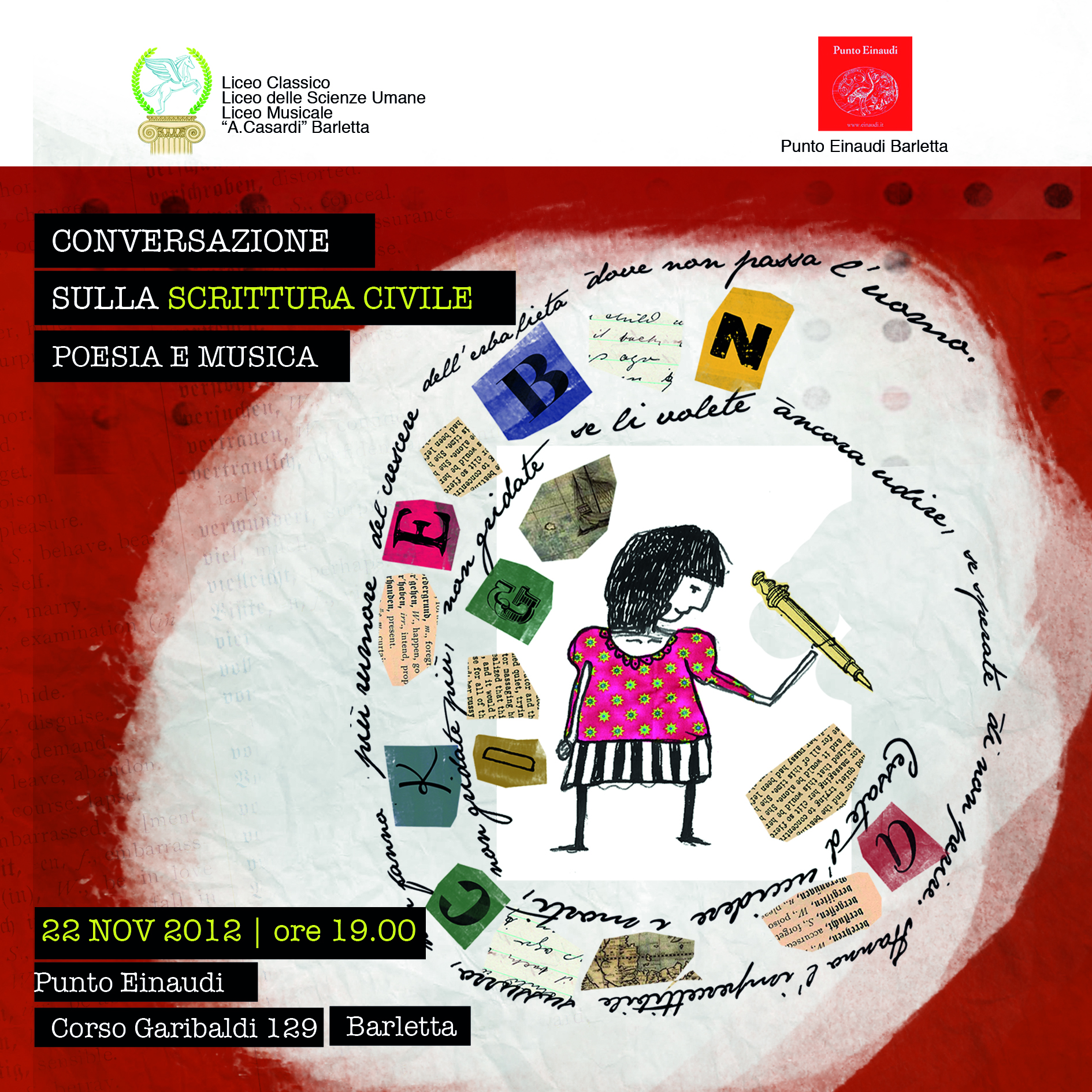 Un dialogo aperto tra poesia e musica sui significati della scrittura civile declinata nelle sue varie forme letterarie: "Conversazione sulla scrittura civile: poesia e musica" è il titolo dell'appuntamento culturale che si svolgerà giovedì 22 novembre alle ore 19:00 presso il Punto Einaudi di Barletta (Corso Garibaldi, 129). L'incontro, promosso dal Liceo Classico, delle Scienze Umane e Musicale "A. Casardi" di Barletta, sarà occasione per ascoltare e commentare le parole dei più grandi autori italiani contemporanei che si sono dedicati alla scrittura civile. Saranno recitati passi di Ungaretti, Montale, Quasimodo, Campana, e altri scrittori che hanno unito arte e impegno civile.