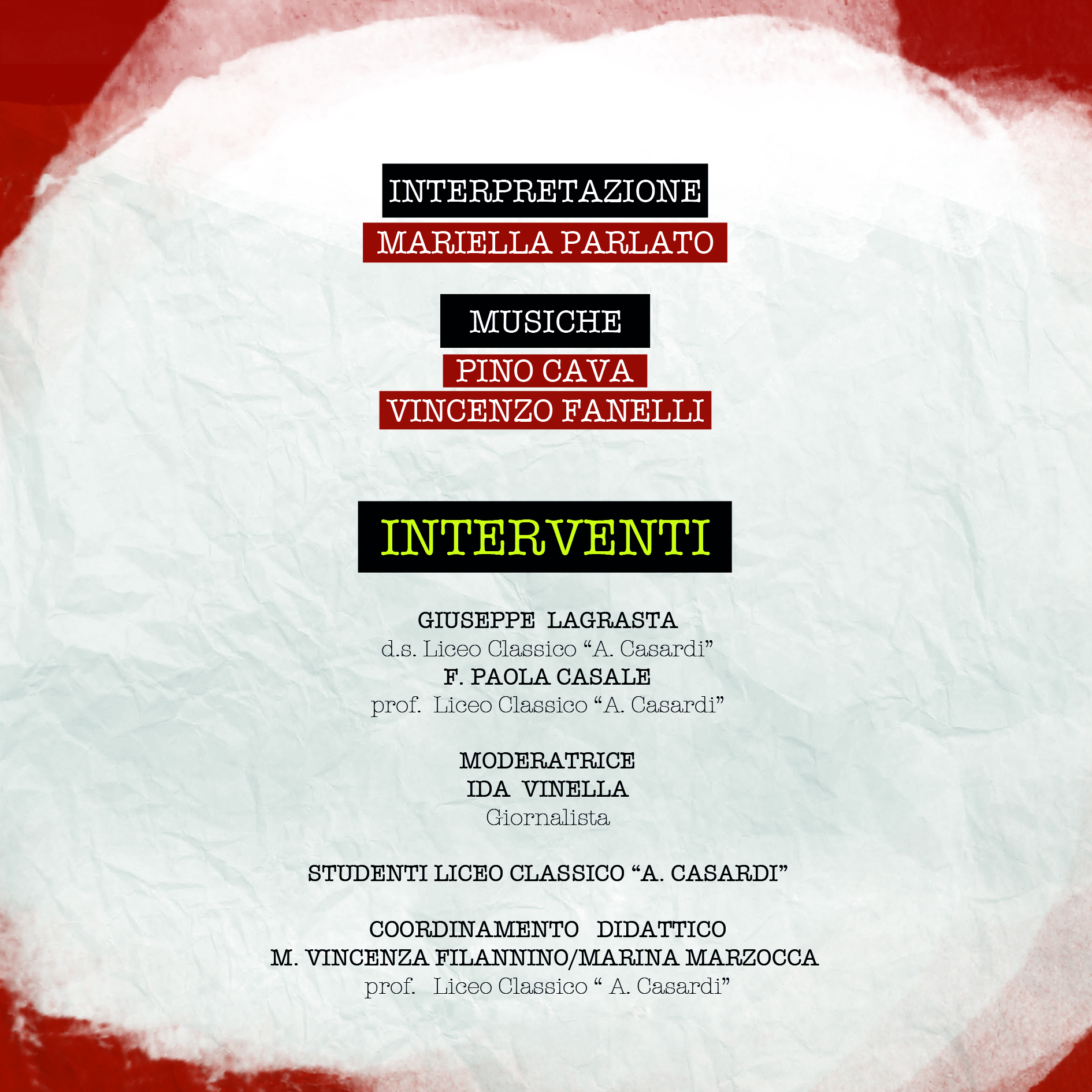 All'incontro, che sarà moderato dalla giornalista Ida Vinella, caporedattrice di Barlettalife.it, interverranno il prof. Giuseppe Lagrasta, dirigente scolastico del Liceo "Casardi", la prof.ssa F. Paola Casale, docente presso il Liceo "Casardi", l'attrice Mariella Parlato (performance recitativa), i maestri Pino Cava e Vincenzo Fanelli (performance musicale) e alcuni alunni del Liceo "Casardi", coordinati dalle professoresse Marina Marzocca e M. Vincenza Filannino.