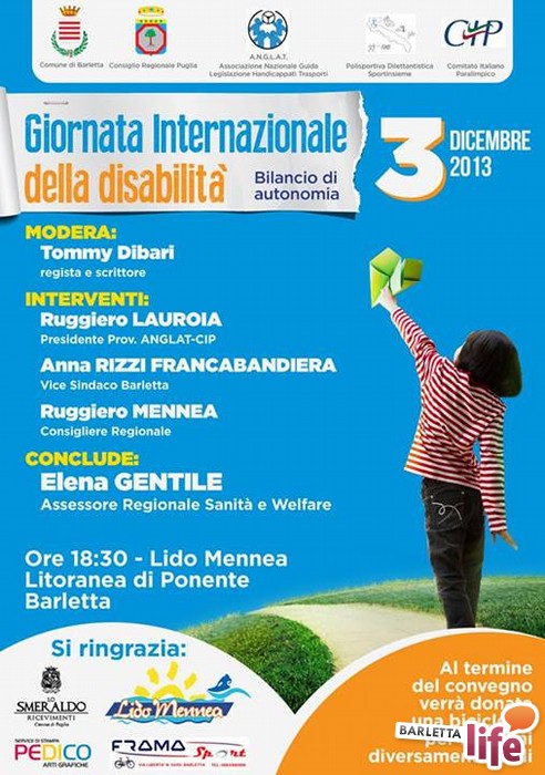 Disabilità e autonomia. Se ne parla martedì 3 dicembre a Barletta, presso il lido "Mennea": in occasione della giornata internazionale della disabilità sarà infatti discusso un "Bilancio di autonomia". L'incontro sarà moderato da Tommy Di Bari, alla presenza di Ruggiero Lauroia (presidente provinciale ANGLAT-CIP), Anna Rizzi Francabandiera, vice-sindaco di Bari e Ruggiero Mennea, consigliere provinciale, con l'intervento conclusivo dell'assessore regionale alla sanità Elena Gentile. Un pomeriggio di incontro e riflessione sul tema.