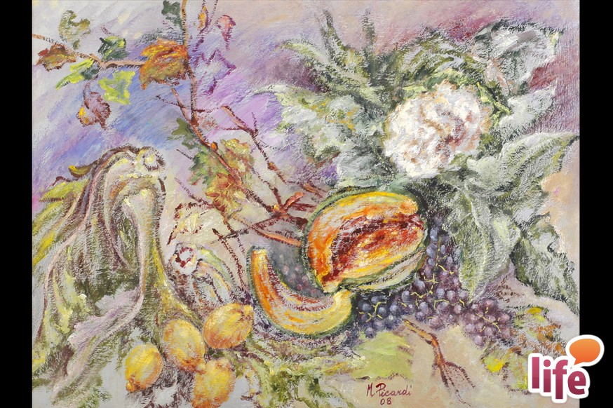 Il tema della natura morta introduce l'esposizione. Quattro tele di grandi dimensioni riassumono il confronto dell'artista con un tema classico della tradizione pittorica. Le composizioni di frutta e ortaggi sono costruite con sapienza attraverso larghe pennellate dense di materia pittorica. L'uva e il melograno – quali richiami alla fertilità e all'abbondanza della terra, accanto alle composizioni di aglio, infilato come una collana, ai finocchi e alle zucche che, invece, rimandano alla semplicità e alla bellezza della vita contadina.