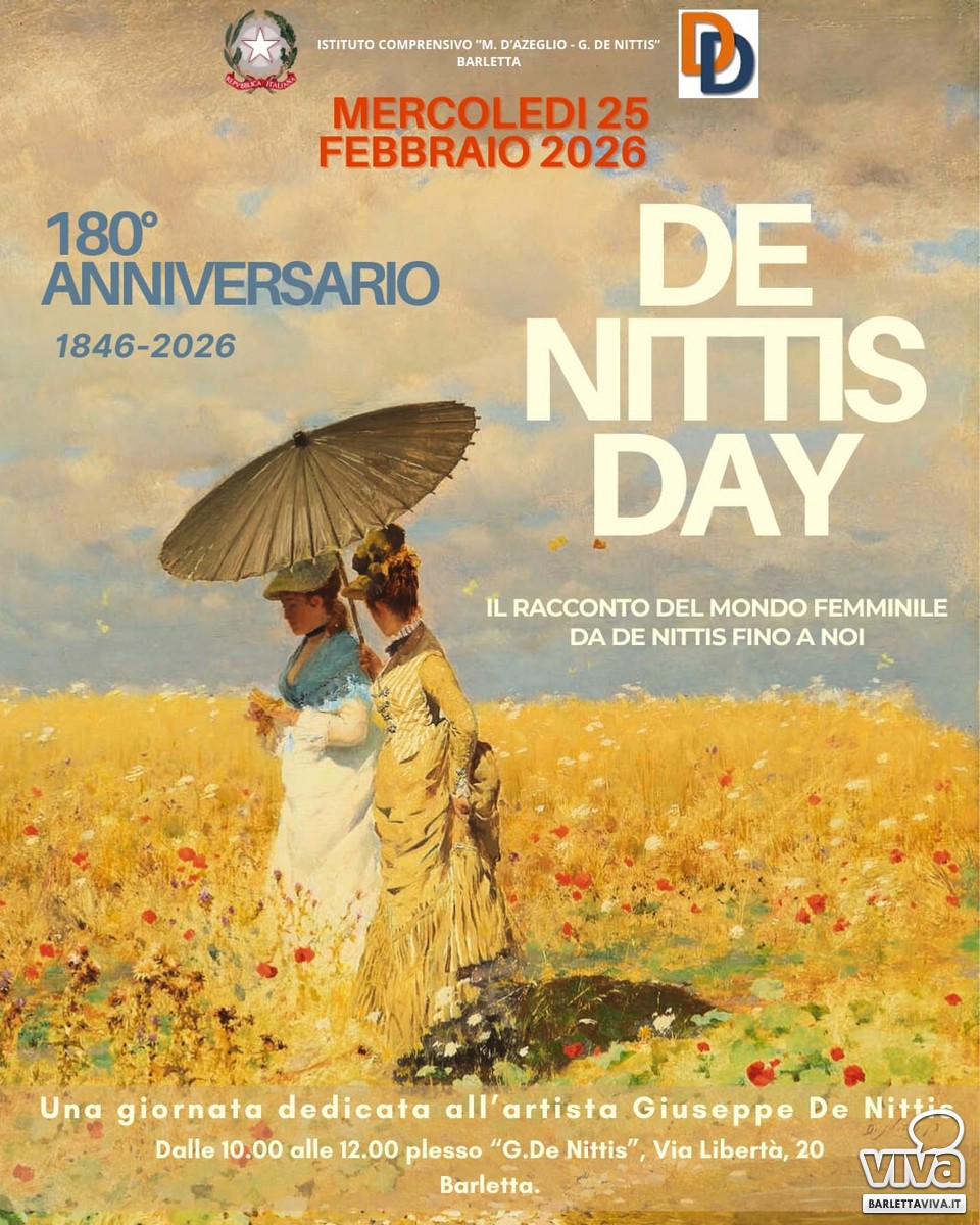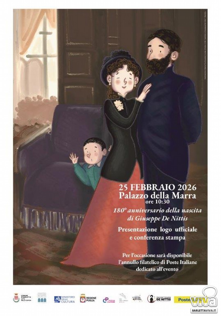 Mercoledì 25 Febbraio, in occasione del 180° anniversario della nascita di Giuseppe De Nittis, si terrà a Palazzo Della Marra alle ore 10:30 la conferenza di presentazione del logo ufficiale e delle iniziative organizzate dal Comune di Barletta per celebrare la ricorrenza. Per questa importante giornata l'Amministrazione Comunale ha previsto l'organizzazione di uno speciale annullo filatelico di Poste Italiane, che utilizzerà il logo ufficiale del 180° anniversario e una cartolina realizzata in collaborazione con il Liceo Artistico di Barletta Léontine e Giuseppe De Nittis.