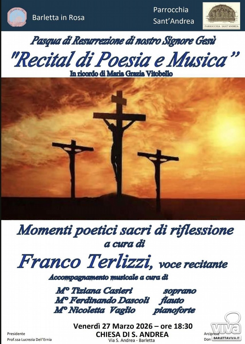In occasione della Pasqua, la Parrocchia Sant'Andrea e l'associazione Barletta in Rosa promuovono un "Recital di Poesia e Musica" in programma venerdì 27 marzo 2026 alle ore 18:30 presso la Chiesa di Sant'Andrea a Barletta.