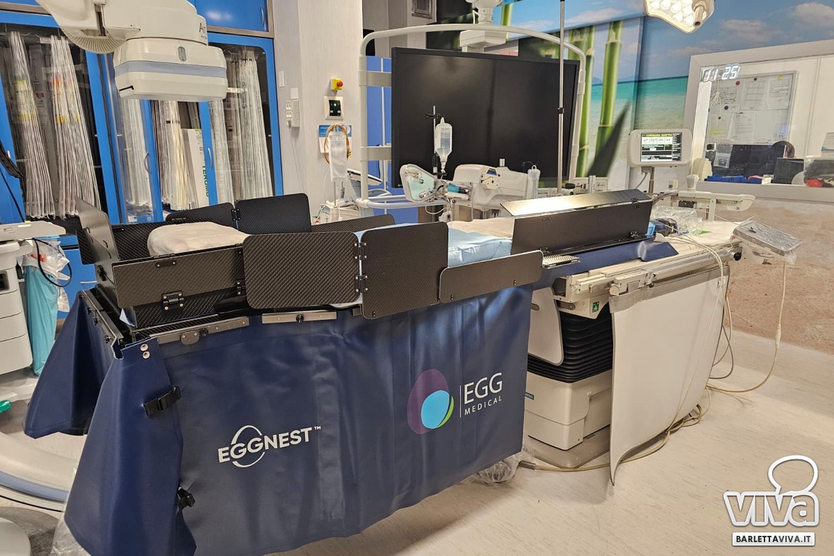 È stato installato in questi giorni, per la prima volta in Puglia, nelle sale operatorie di Emodinamica ed Elettrofisiologia del Bonomo di Andria e nella sala operatoria di Elettrofisiologia del Dimiccoli di Barletta, il sistema EggNest di radioprotezione passiva, progettato per proteggere tutto il personale sanitario presente in sala durante le procedure effettuate con radiazioni ionizzanti (70–100 keV). Il sistema riduce le radiazioni diffuse di circa il 90% (equivalente a 0,5 mm di piombo) e garantisce una protezione a 360 gradi attorno al paziente. Il sistema è integrato nel lettino e si muove con esso, non intralciando le procedure.