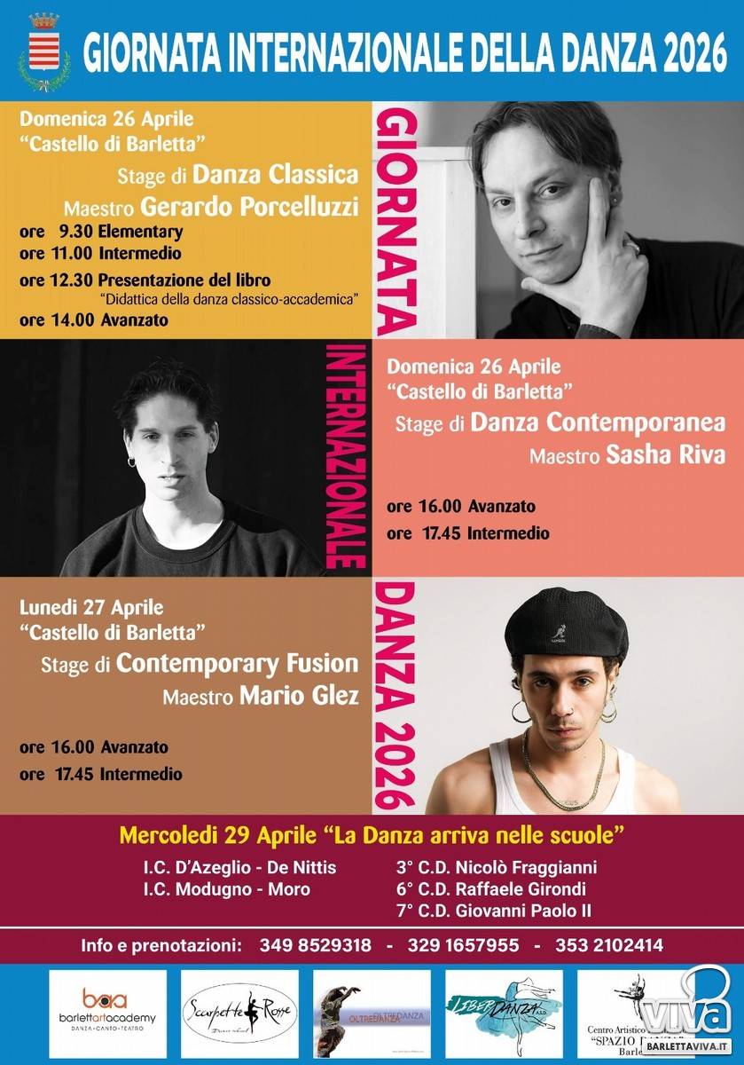 ● 27 aprile – pomeriggio • Lezioni di danza contemporanea fusion con il M° Mario Glezz 29 APRILE 2026 – ''La Danza Entra Nelle Scuole'' Nel giorno ufficiale della Giornata Internazionale della Danza, le insegnanti delle associazioni coinvolte porteranno la danza direttamente all'interno delle scuole elementari e medie di Barletta, con attività artistiche e laboratori creativi. Le insegnanti che condurranno le attività sono: Defazio Danila, Dicataldo Fausta, Dicataldo Grazia, Dimiccoli Angela, Dimiccoli Maria Antonietta, Filannino Maria, Lemma Maria Grazia e Russo Michele Pio. Gli Istituti scolastici che hanno aderito al progetto con entusiasmo includono: 3° C.D. N. Fraggianni, 6° C.D. R. Girondi, 7° C.D. Giovanni Paolo II, I.C. M. D'Azeglio-G. De Nittis, e I.C.S. G. Modugno-R. Moro. Per stimolare ulteriormente l'interesse dei giovani verso l'arte coreutica, le scuole di danza offriranno una borsa di studio a studenti meritevoli di ciascun Istituto partecipante.