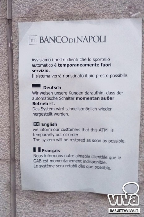 Ancora un assalto ad un bancomat, ancora con la stessa modalità. Dopo il doppio tentativo – a distanza di una settimana – di svaligiare la sede del Banco di Napoli in via Canosa, tocca ad un'altra filiale dello stesso gruppo, sempre nella periferia di Barletta, ma stavolta situata in via Madonna della Croce, proprio di fronte all'istituto "Archimede".