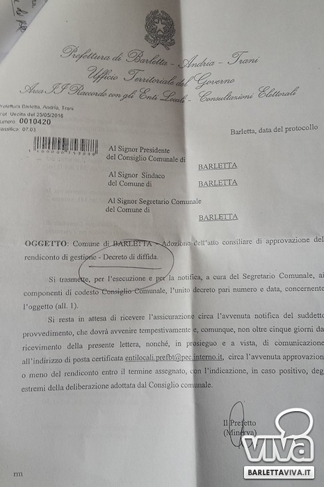«A Barletta per approvare il rendiconto di gestione del 2015 occorre che arrivi prima il "Decreto di diffida" della Prefettura». Lo denuncia il consigliere comunale Carmine Doronzo, che espone la lettera giunta oggi all'intero consiglio comunale relativamente al rendiconto di gestione non ancora approvato e per il quale il Comune di Barletta è stato ufficialmente diffidato. «Questa è la situazione nella quale versa il nostro Comune - scrive Doronzo in una nota - Come spesso accade ci troviamo a denunciare una situazione di emergenza di cui siamo stati facili profeti, infatti con disinvolta incuranza da parte del Sindaco e della Giunta, da sempre commissariati dal dirigente al ramo, il bilancio consuntivo che doveva essere approvato entro il 30 aprile slitta di un mese, con buona pace degli inconsapevoli cittadini e del Prefetto che si trova costretto a diffidare Cascella dal temporeggiare ulteriormente all'adempimento contabile.
