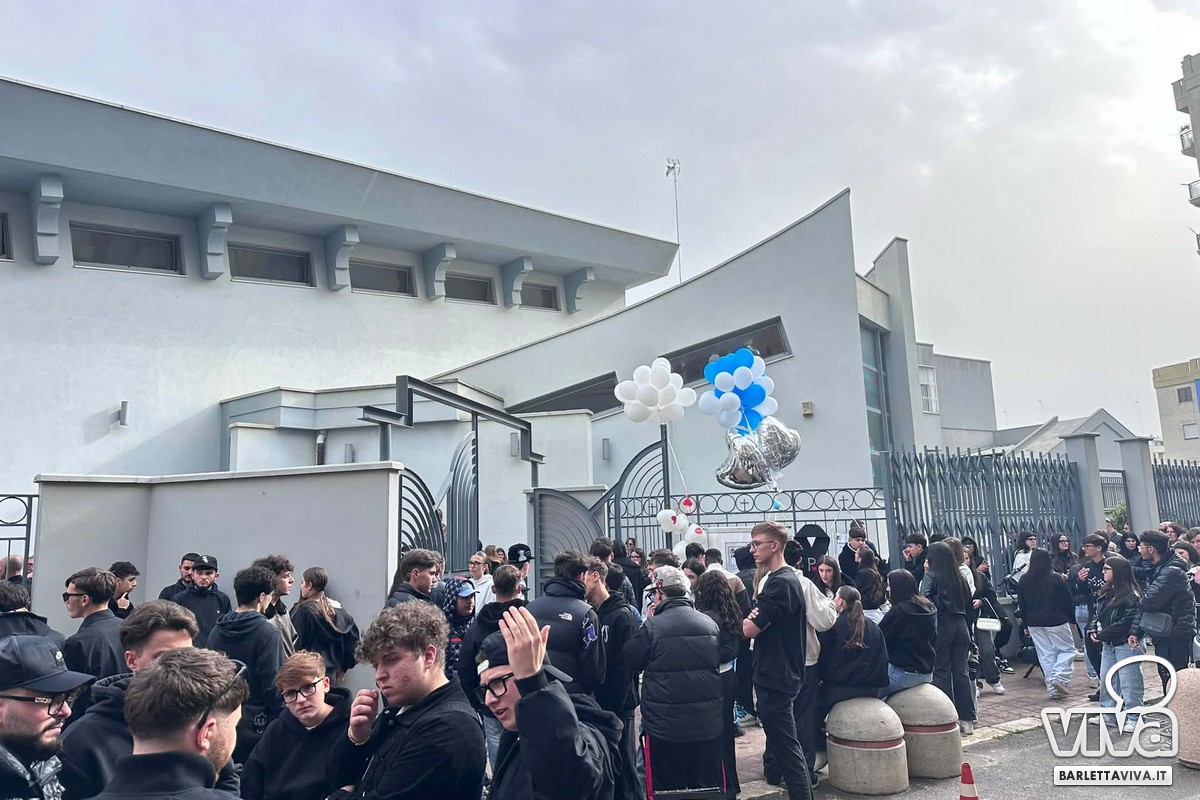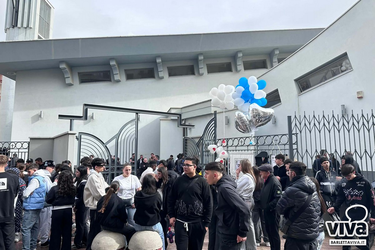 All'uscita, i palloncini in volo per ricordare il 16enne, mentre Barletta continua ad osservare la giornata di lutto cittadino.