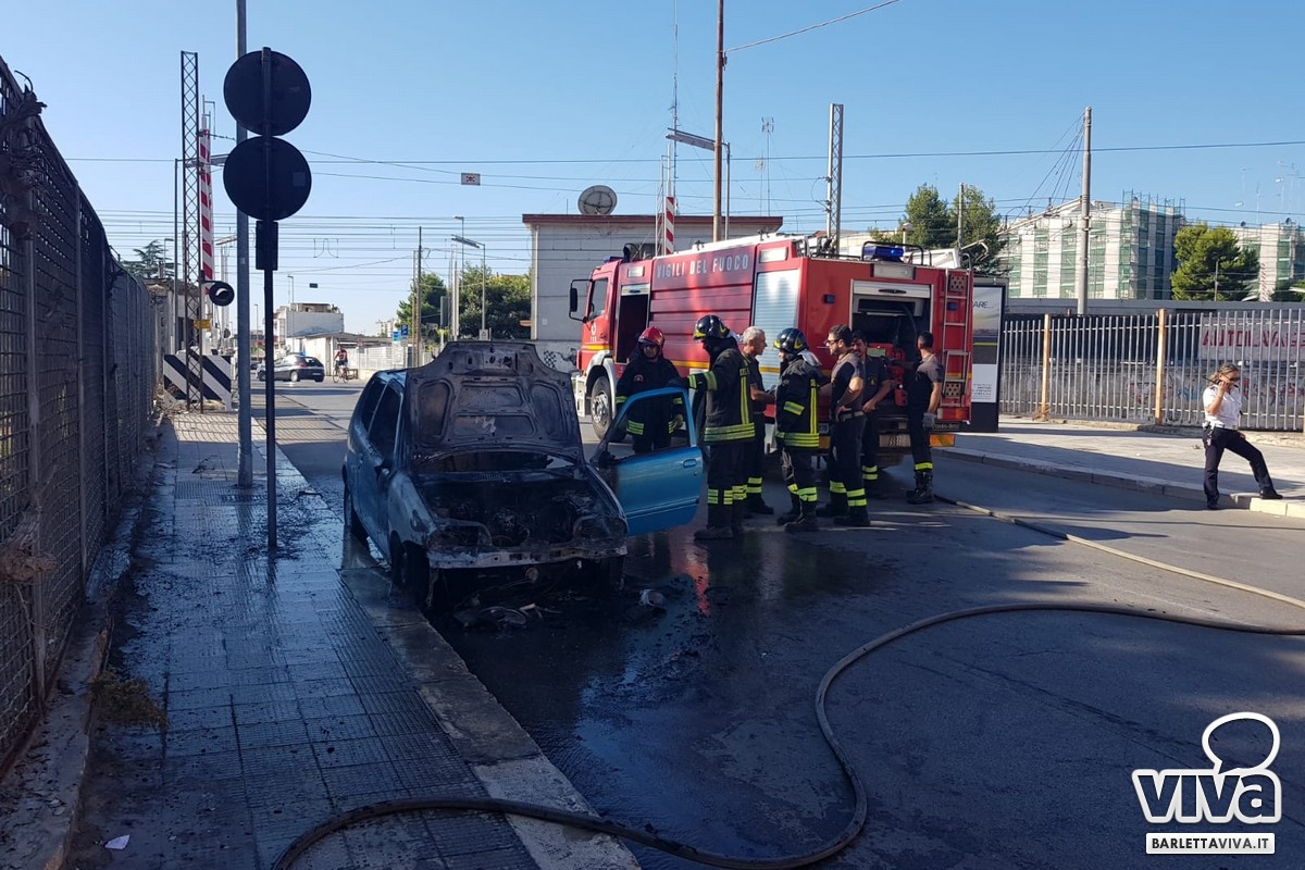 È accaduto questa mattina alle ore 9.20. Le fiamme hanno distrutto una Fiat 600 nei pressi del passaggio a livello di via Andria. L'ingresso è stato bloccato a causa della presenza della carcassa del veicolo sulla carreggiata.