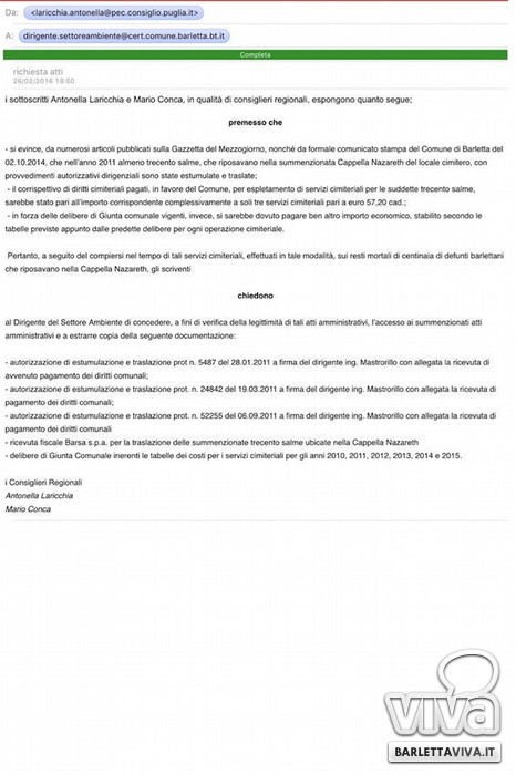«Già a Luglio, nel corso di un pubblico incontro, alla presenza dei Portavoce del M5S in Consiglio Regionale Antonella Laricchia e Mario Conca, chiedevamo chiarezza sulla questione, ma nulla; così abbiamo continuato a produrre comunicati stampa e solleciti, ultimo quello a mezzo PEC del 26 febbraio firmato dai Portavoce alla Regione Antonella Laricchia e Mario Conca. Non abbiamo ricavato alcuna evidenza sul tema, nemmeno dalla commissione Temporanea speciale per i servizi cimiteriali, che pure in data 10/09/2015 riportava tra gli ordini del giorno proprio l'analisi e la discussione della documentazione relativa alla Cappella Nazareth. Ad oggi, rimane, come dato inoppugnabile, solo la mestizia provata nel 2012 da un nostro concittadino che, recandosi al cimitero di Barletta per visitare i propri familiari che riposavano nella Cappella Nazareth, scopre che nel loculo di famiglia era stato sepolto un illustre sconosciuto. Oltre 300 sarebbero le estumulazioni effettuate nella medesima Cappella per far posto ad altri defunti.