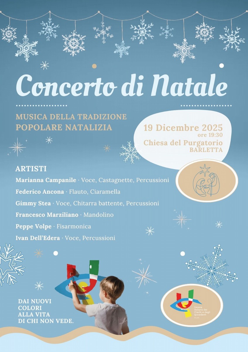 Il calore delle feste si accende a Barletta con un evento unico: "Concerto di Natale", un concerto dedicato alla musica della tradizione popolare natalizia. L'iniziativa è organizzata dall'Unione Italiana dei Ciechi e degli Ipovedenti – Sezione Territoriale di Barletta-Andria-Trani, che da sempre promuove attività culturali e sociali volte all'inclusione e alla partecipazione attiva delle persone non vedenti e ipovedenti nella vita comunitaria.