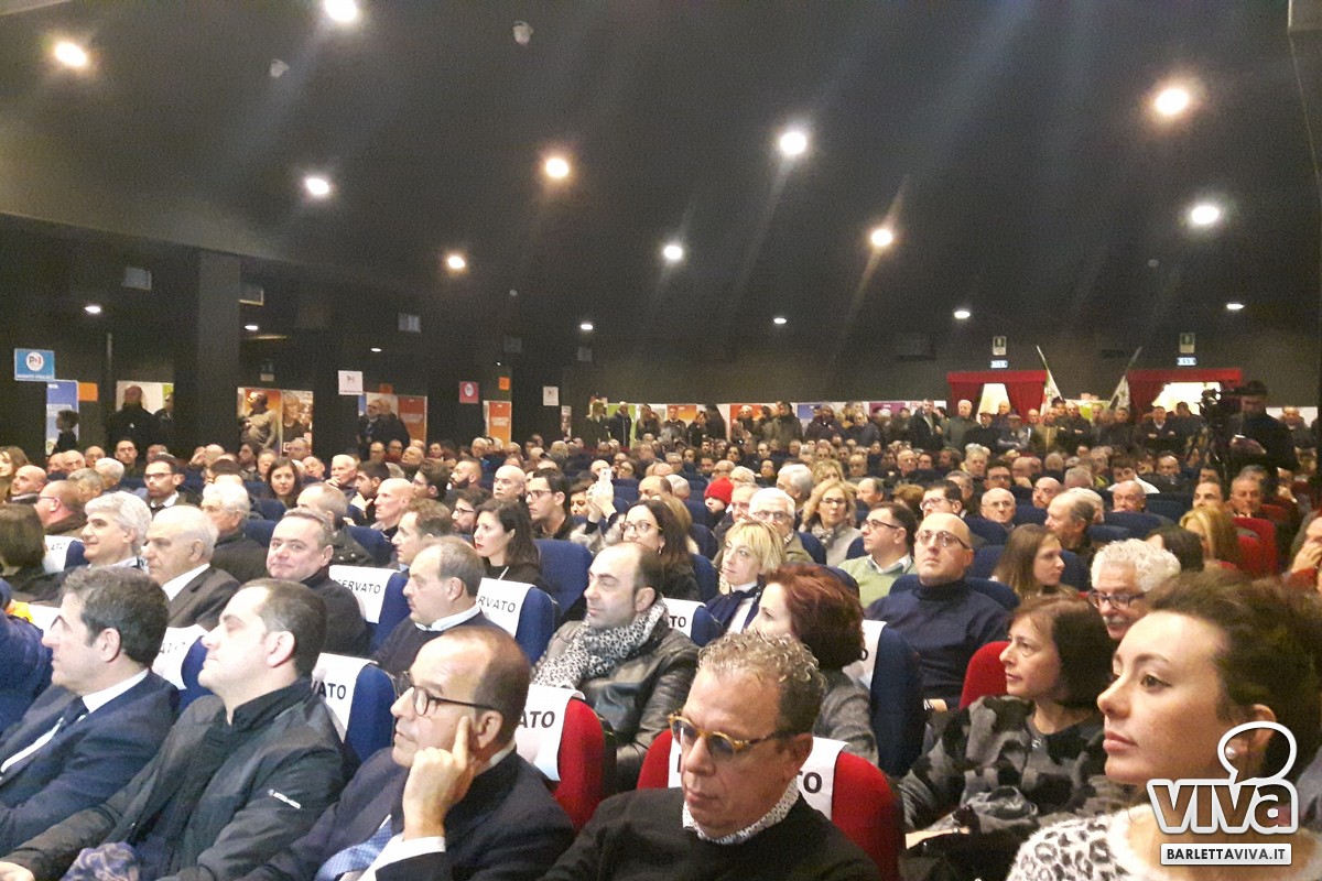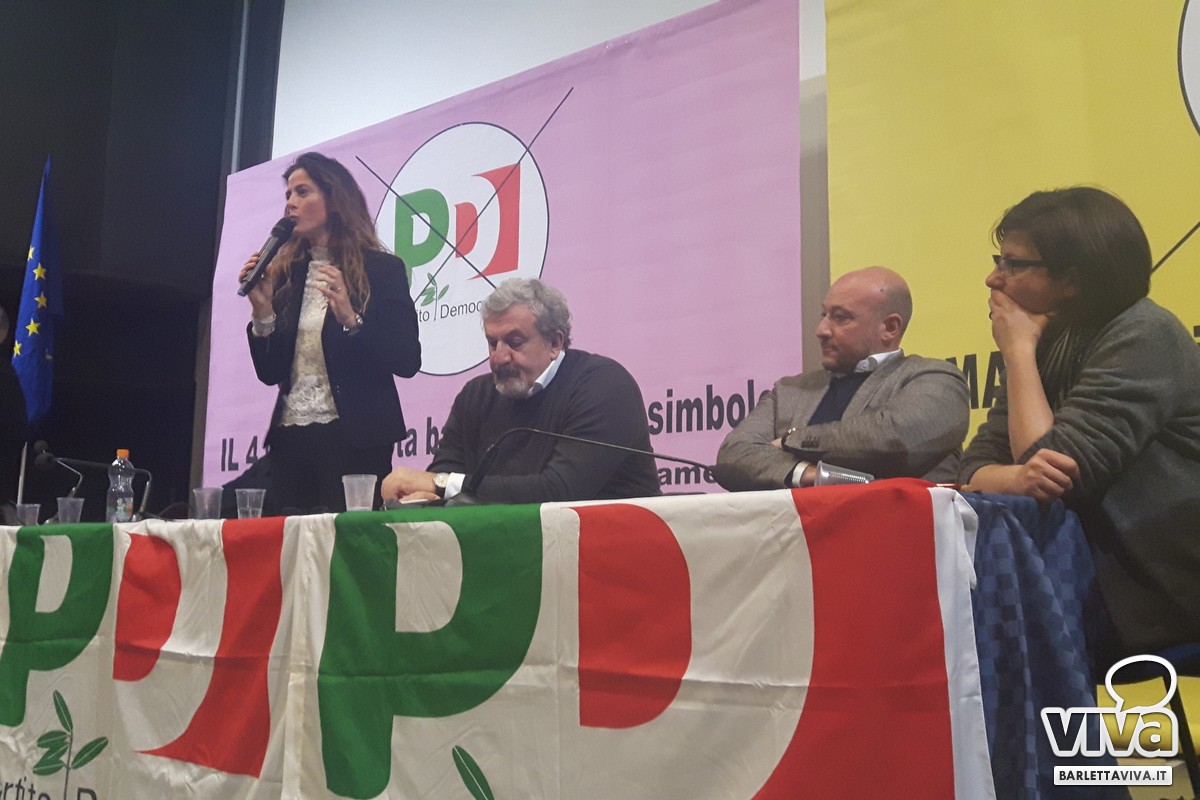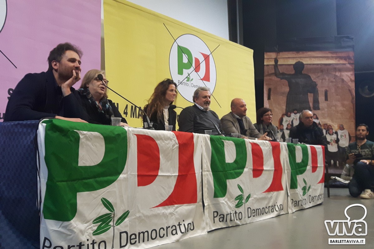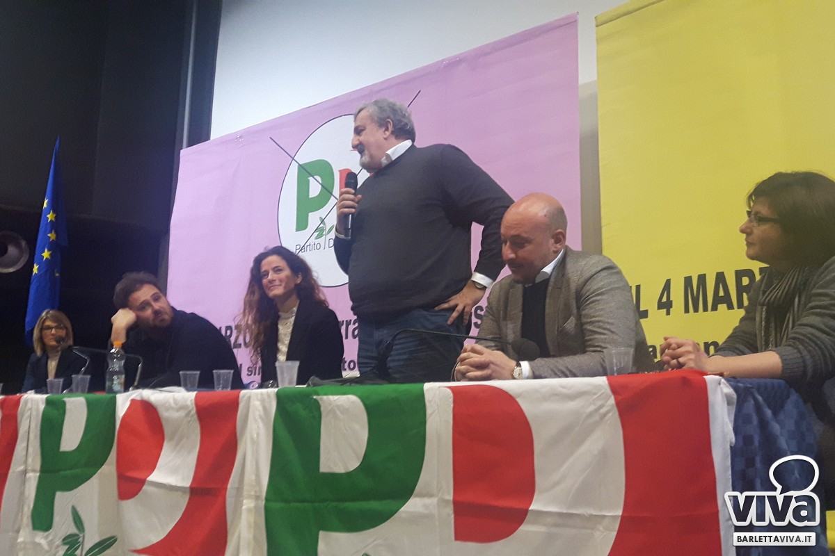 Si è tenuta ieri mattina presso la sala Manfredi del Cinema Paolillo di Barletta la manifestazione elettorale promossa dal Partito Democratico. Ad una settimana dalle elezioni politiche del 4 marzo sono stati presentati i candidati del PD (sia alla Camera dei Deputati che al Senato). A fianco di Michele Emiliano, Presidente della Regione Puglia, sono intervenuti nel corso del dibattito: Filippo Caracciolo, candidato alla Camera dei Deputati, l'onorevole Elena Gentile, europarlamentare candidata al Senato della Repubblica nel collegio uninominale Puglia 3, Assuntela Messina, presidente dell'assemblea regionale del Partito Democratico anch'essa candidata al Senato della Repubblica, e i tranesi Debora Ciliento - assessore ai servizi sociali del comune di Trani - Carlo Avantario e Fabrizio Ferrante. L'incontro è stato finalizzato a rimarcare l'importanza di un appuntamento (quello delle elezioni) a cui è chiamata l'intera nazione e a cui anche la regione Puglia non può mancare. Fil rouge la domanda iniziale sul perché votare il Partito Democratico. Rivolgendosi alla cittadinanza, riunitasi numerosa in sala, sono state messe in luce le politiche promosse fin ora dal PD e quelle in programma. A seguito infatti di uno spot introduttivo Nicola Defazio - segretario del circolo del Partito Democratico di Barletta - e Rosanna Maffione hanno dato spazio ad una serie di interventi, dando voce alla platea prima di dar la parola ai candidati.