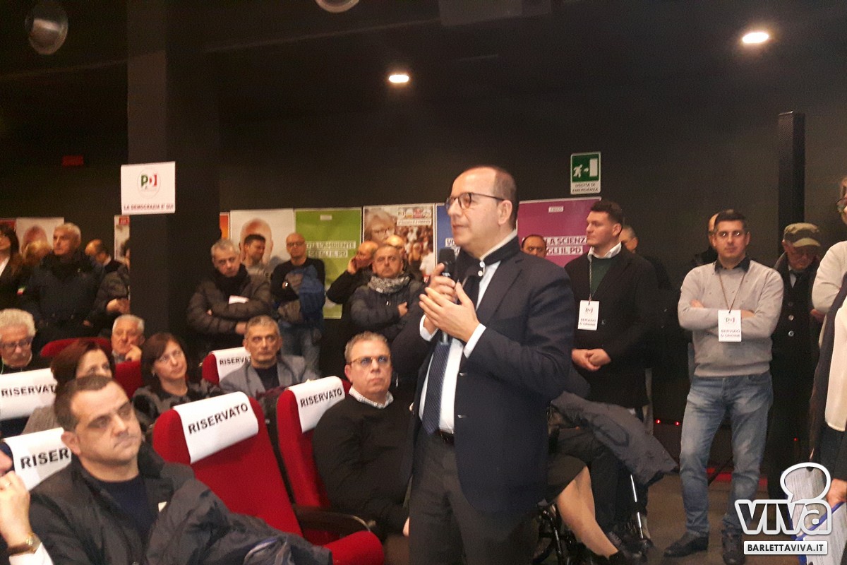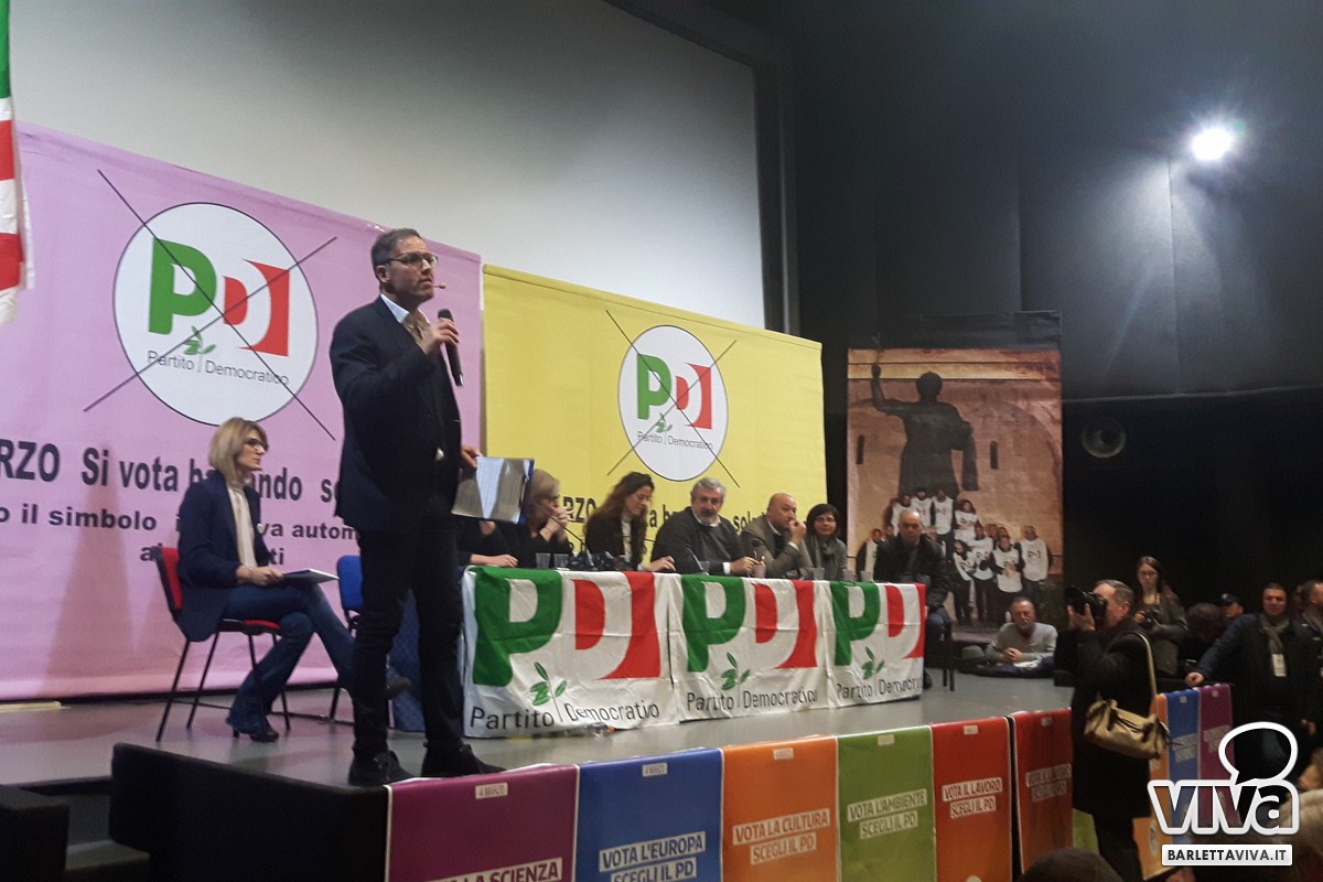 Ultimo l'intervento del Presidente Michele Emiliano: «Conosco le condizioni della vita vera e so che se la politica non dà risposte a quelle condizioni non servono volantini o slogan politici. Ciò che mi preme sottolineare è la necessità di una cultura politica del sud. La Bat che ha contato sempre abbastanza poco, con Filippo Caracciolo e Assuntela Messina potrebbe avere una rappresentanza finalmente. Stiamo difendendo un partito nato dalla Resistenza - Barletta è una città Medaglia d'oro - è il partito che ha costruito il rapporto con il mondo del lavoro, con il movimento operaio, con i contadini. Dobbiamo avere un buon risultato in Puglia il ragionamento è stato quello della qualità della classe dirigente. Se riuscissimo a fare questa doppietta (riferendosi ai candidati Caracciolo e Messina) sarebbero perfettamente assortiti dal punto di vista politico e il ruolo che questa provincia e il contributo che può dare alla provincia di Foggia sarebbe importante. La democrazia è per me una cosa seria».