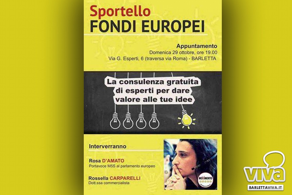 Esiste, contemplato nel settore politiche attive di sviluppo presso il Comune di Barletta, un ufficio dedicato ai Fondi Europei, tuttavia nel corso di incontri tematici tenuti con la cittadinanza è emerso che vi è ancora poca informazione su questa preziosa opportunità. Senza volersi sostituire allo sportello comunale, a cura di Barletta cinque stelle, nasce un ulteriore punto informativo sui Fondi Europei. Si tratta di un servizio, offerto a titolo gratuito alla cittadinanza e alle aziende, che consentirà di attingere alle prime informazioni sulle misure agevolative previste dall'Unione Europea. L'impegno messo in campo, in particolar modo su tutto il territorio pugliese, dall'eurodeputata del Movimento 5 Stelle, Rosa D'Amato, ha accorciato la distanza tra coloro i quali hanno un'idea progettuale e la possibilità di concretizzarla».