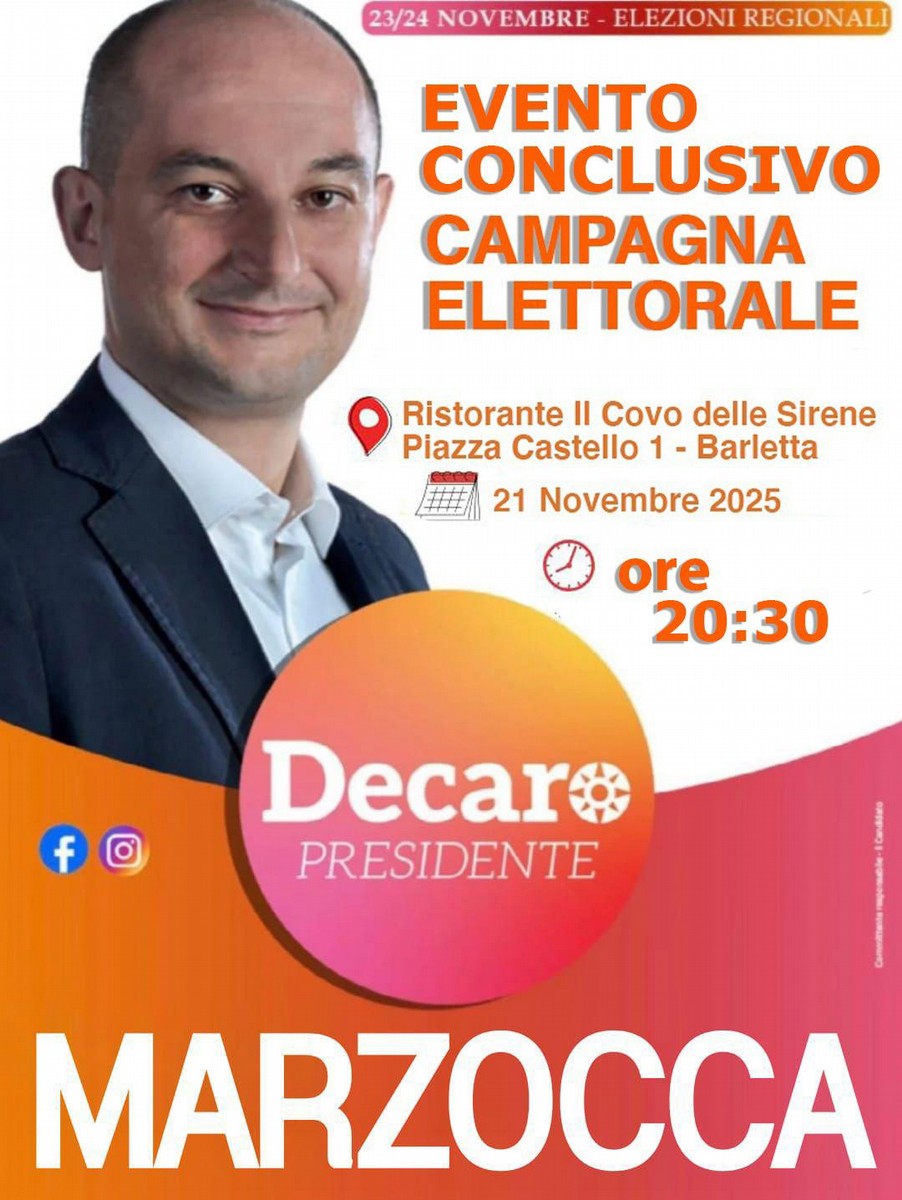 Un invito alla partecipazione per ringraziare e salutare tutti gli amici, i conoscenti e i cittadini incontrati in questo periodo di campagna elettorale: così l'avvocato barlettano Ruggiero Marzocca si prepara questa sera a chiudere il periodo di incontri e ascolto sul territorio, nell'attesa del voto di domenica e lunedì per le elezioni regionali.