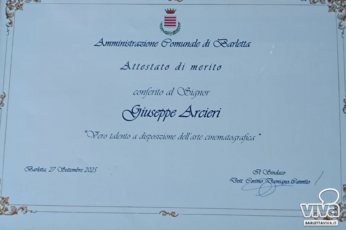Il regista Giuseppe Arcieri ha ricevuto un importante riconoscimento dall'Amministrazione Comunale di Barletta: l'Attestato di Merito, conferito direttamente dal Sindaco Cosimo Damiano Cannito.