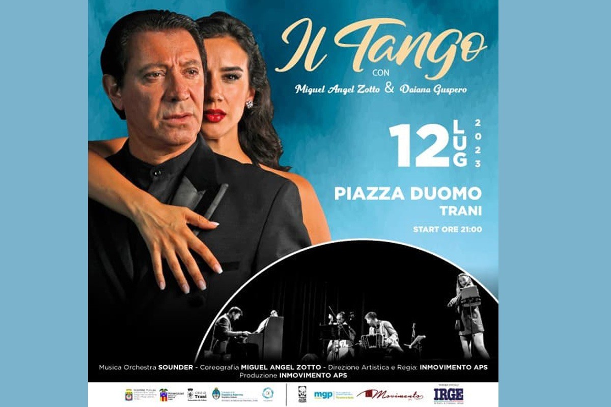 Miguel Angel Zotto sarà a Trani mercoledì 12 luglio in piazza Duomo con l'intenso Il Tango, lo struggente spettacolo in cui Zotto danzerà con la compagna di vita Daiana Guspero, ballerina stimata a livello mondiale. Con la loro straordinaria bravura daranno vita ad esibizioni che trasferiscono il fascino dell'alchimia tra i due artisti, che appare travolgente anche agli occhi dei non appassionati della danza argentina.