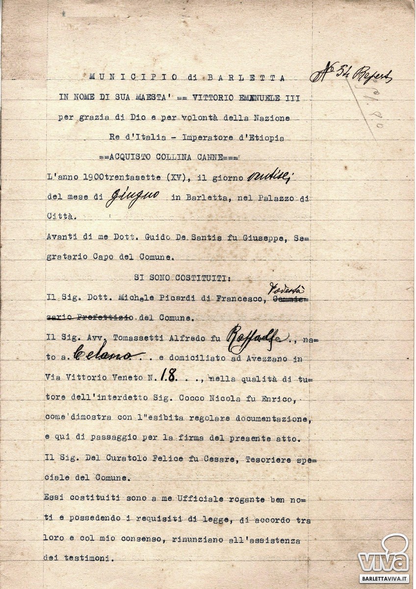 Per fortuna che l'accorato appello lanciato da ogni parte del settore cultura della società civile barlettana, venne accolto e il 26 giugno del 1937 il Comune di Barletta nella figura del Podestà dott. Michele Picardi, acquistava dall'avv. Alfredo Tomassetti, tutore del sig. Cocco Nicola proprietario, una zona di terreno denominata "Monte Canne" in contrada omonima, della superficie di ettari 8.79.40 iscritta in catasto alla partita n. 2327, foglio 43, particella 13, per la somma complessiva di £. 9.784,44. Non si pensi, però, che da quel momento per Canne tutto divenne facile e bello…macché!