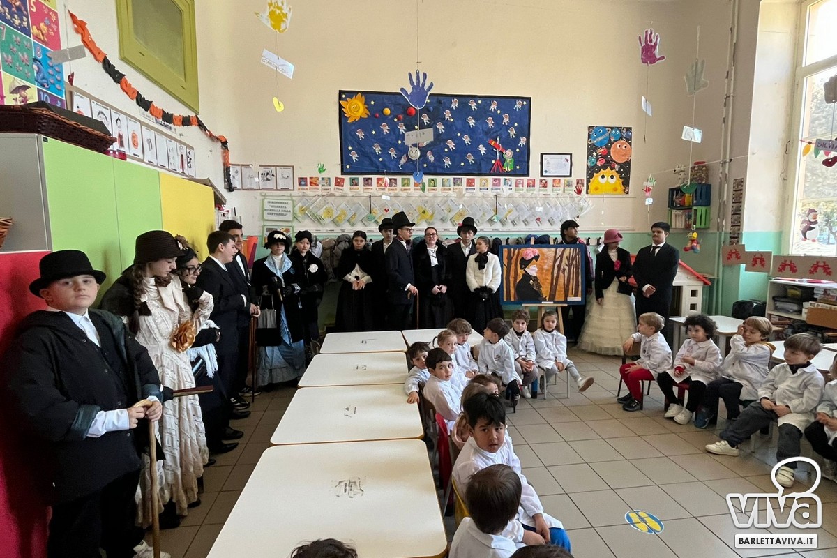 Nel cortile del plesso, i ragazzi delle classi terze hanno dipinto "en plein air", cavalletti e colori alla mano, rievocando la tecnica e le suggestioni impressioniste care all'artista. Un'immagine potente: giovani studenti chini sulle tele, immersi nella luce naturale, proprio come avrebbe fatto il nostro Peppino De Nittis.Contemporaneamente, una suggestiva promenade in abiti ottocenteschi ha condotto gli alunni tra i luoghi simbolo della memoria cittadina: dal busto dedicato al pittore nei giardini a lui intitolati, fino alla casa paterna e al Teatro Curci. Un percorso non solo fisico ma simbolico, capace di intrecciare scuola, città e identità culturale.