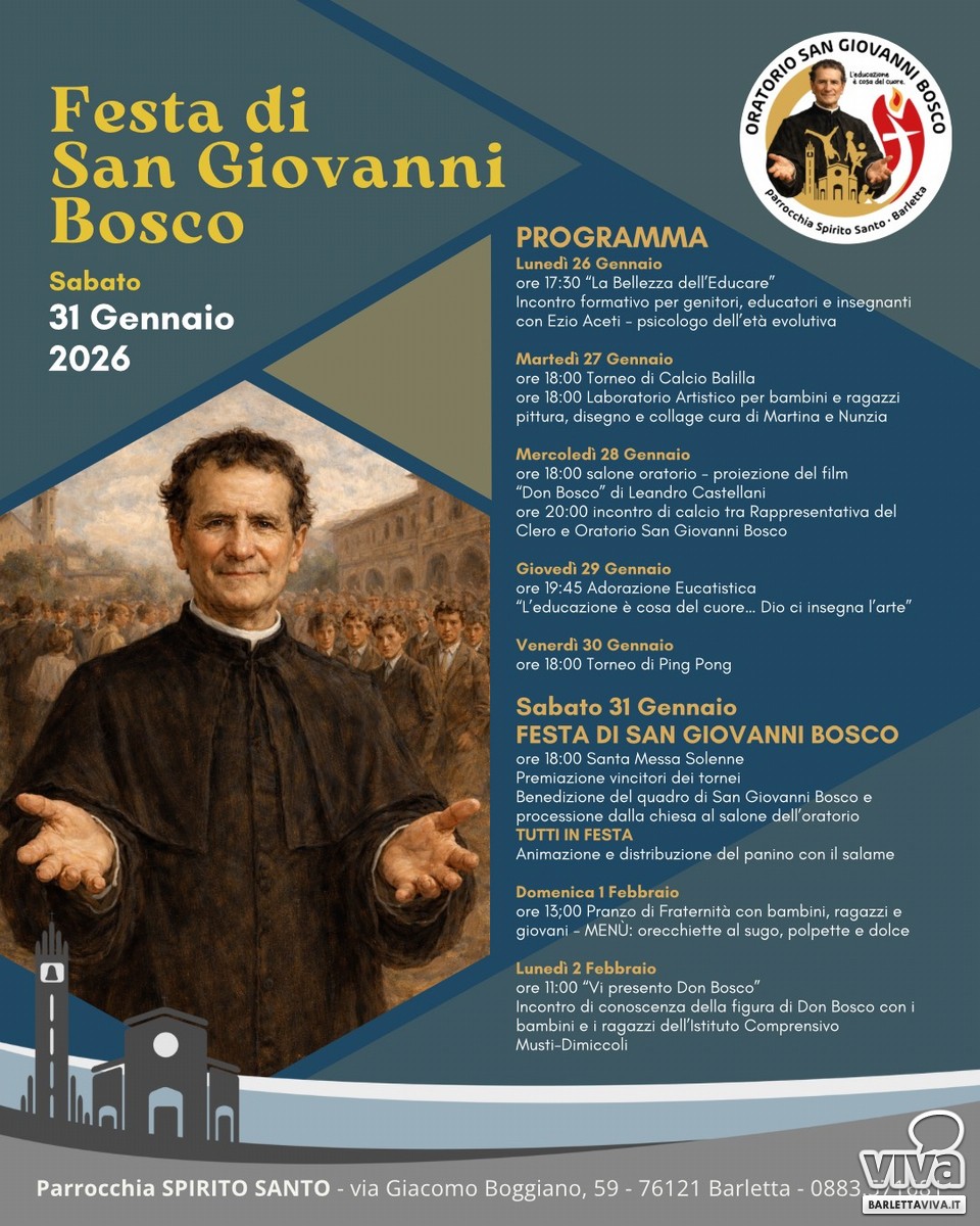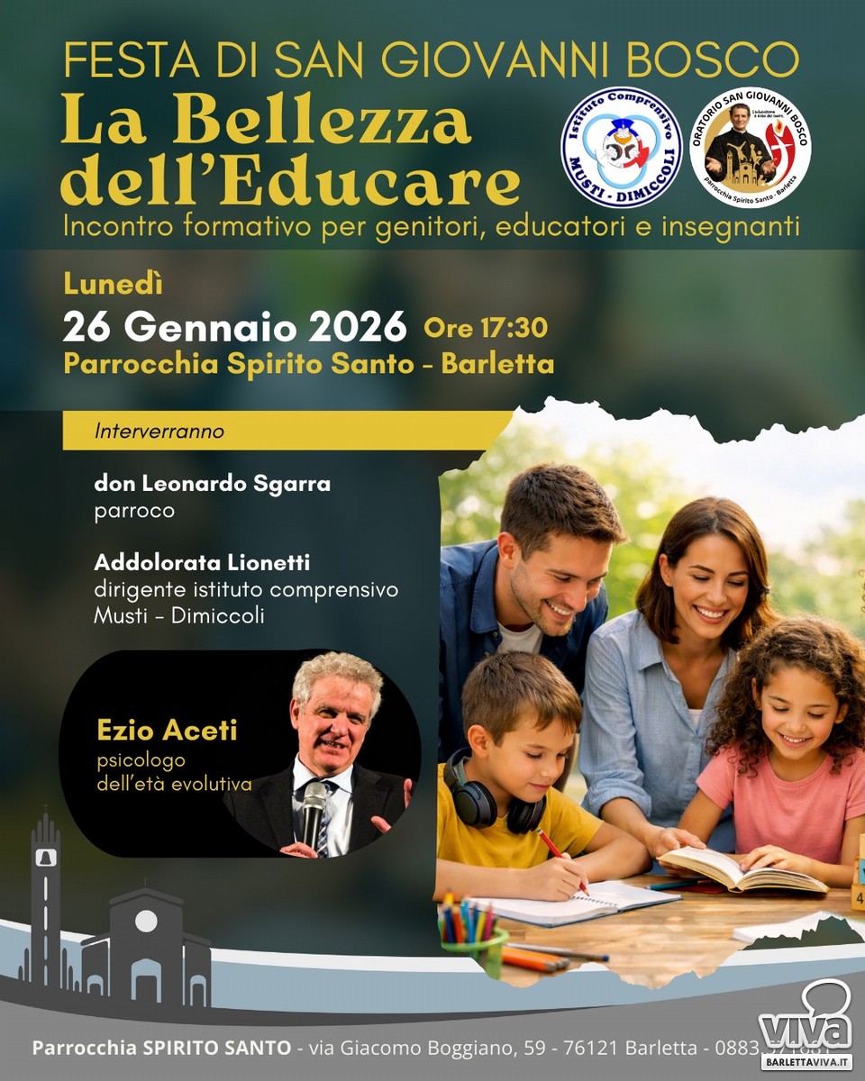 In occasione della prima festa di San Giovanni Bosco nel nuovo oratorio, la Parrocchia Spirito Santo di Barletta promuove un significativo incontro formativo rivolto a genitori, educatori e insegnanti, dal titolo "La Bellezza dell'Educare", affidato a un relatore di grande prestigio: Ezio Aceti, psicologo dell'età evolutiva e formatore di riconosciuta esperienza a livello nazionale. L'incontro si terràlunedì̀26 gennaio alle ore 17:30, presso la Parrocchia Spirito Santo di Barletta, e rappresenta un'occasione preziosa di crescita umana e spirituale per tutta la comunità educante.