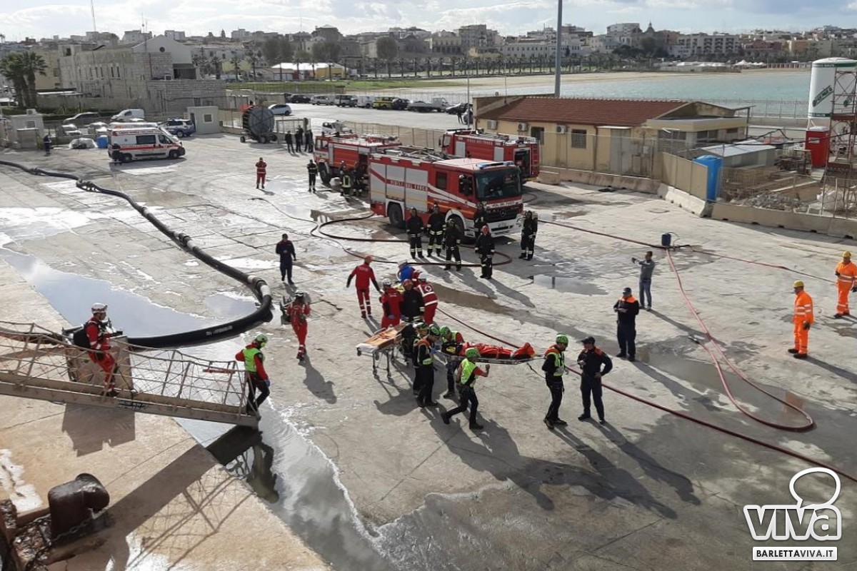È stata simulata l'esplosione del congegno presente in banchina che ha fatto scattare l'immediata attivazione dei piani di emergenza portuale in caso di atto terroristico, nonché di incendio e di inquinamento. La Sala Operativa della Capitaneria di porto, allertata dal comando di bordo e dall'Agente di sicurezza del porto, ha ordinato l'immediata evacuazione dell'area intorno alla nave, disposto l'uscita di una propria motovedetta e richiesto il supporto di tutte le Forze di Pubblica sicurezza e di soccorso, che si sono tempestivamente recate sul luogo. Le pattuglie di Polizia, Carabinieri e Guardia di Finanza hanno creato una cornice di sicurezza intorno al porto, mentre quella della Polizia Locale di Barletta ha provveduto a gestire la viabilità cittadina per consentire l'agevole intervento delle altre squadre di soccorso. L'intervento del Nucleo Artificieri della Questura di Bari ha permesso l'individuazione e la bonifica del secondo ordigno presente a bordo. Appen al'area è stata dichiarata libera da altri esplosivi, i Vigili del Fuoco hanno potuto procedere all'estinzione dell'incendio, consentendo così, alle squadre di soccorso, di poter accedere a bordo per prestare assistenza medica ai feriti. Due di essi, in codice giallo, sono stati trasferiti dalle autombulanze del 118 e della Croce Rossa Italiana presso il locale presidio sanitario, mentre un terzo ferito, in codice rosso, è stato trasportato d'urgenza mediante un elicottero di Alidaunia S.r.l., grazie all'intervento del Corpo Nazionale di Soccorso Alpino e Speleologico attivato dalla Sezione di Protezione Civile della Regione Puglia.