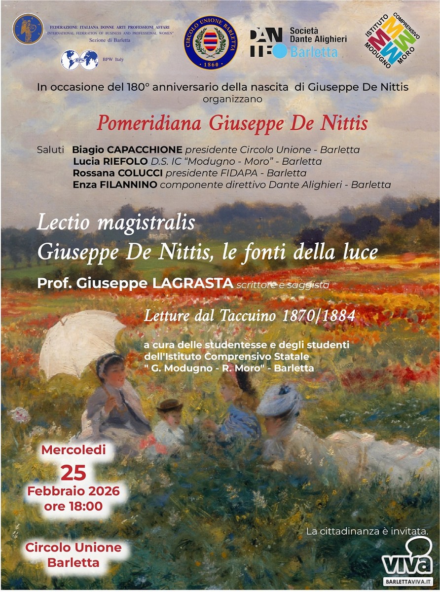 Mercoledì 25 febbraio, alle ore 18, il Circolo Unione di Barletta ospiterà la "Pomeridiana Giuseppe De Nittis", iniziativa promossa in occasione del 180° anniversario della nascita del grande pittore barlettano. L'evento è organizzato congiuntamente dallo stesso Circolo Unione, insieme a FIDAPA - Federazione Italiana Donne Arti Professioni Affari (sezione di Barletta), Società Dante Alighieri (Comitato di Barletta) e Istituto Comprensivo Statale "G. Modugno - R. Moro" di Barletta.