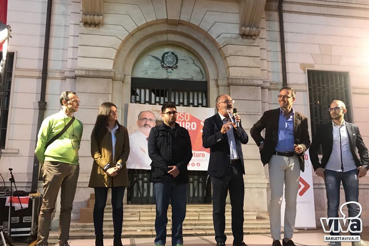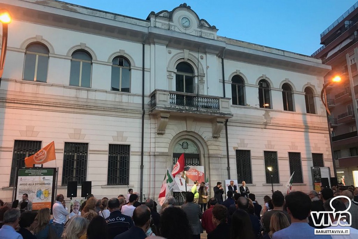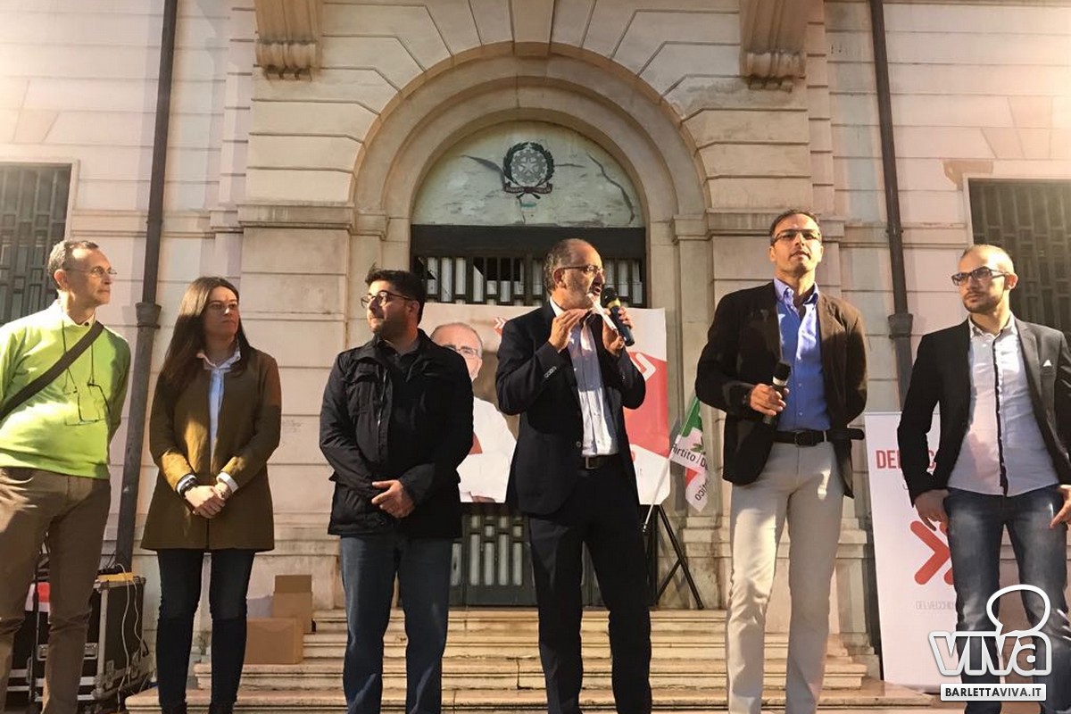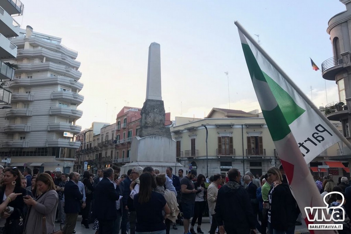 Grande la partecipazione cittadina in piazza Caduti ieri sera per la presentazione delle quattro liste a sostegno del candidato sindaco Dino Delvecchio: Barletta più, Articolo uno, Barletta verso il futuro e Partito Democratico.