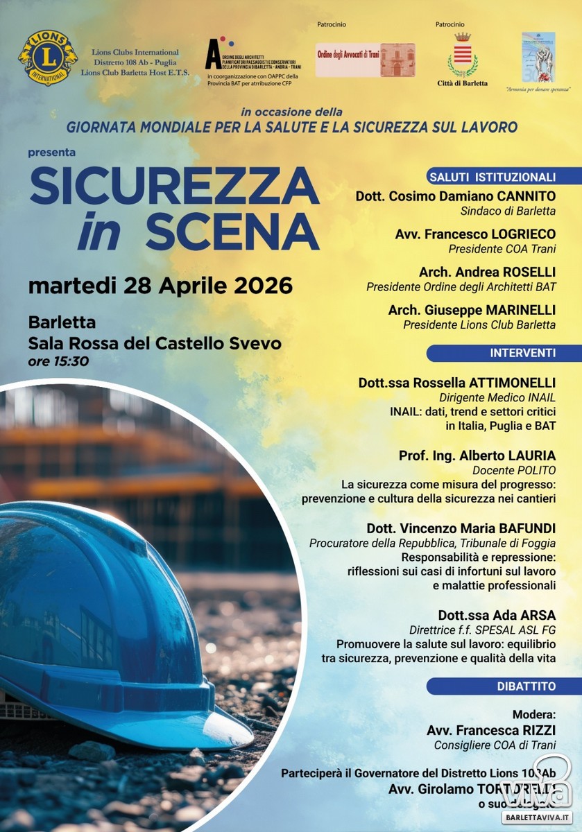 In occasione della Giornata Mondiale per la salute e la sicurezza sul lavoro, il Lions Club Barletta Host ETS promuove un importante momento di riflessione e confronto sul tema della tutela della salute e della sicurezza nei luoghi di lavoro. L'evento, dal titolo "Sicurezza in scena", si terrà il 28 aprile 2026, dalle ore 15.30, presso la Sala Rossa del Castello Svevo di Barletta.