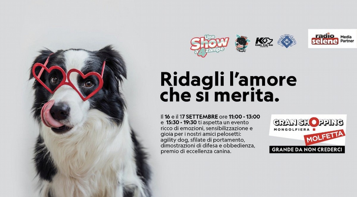 Il prossimo fine settimana le attività del Gran Shopping Molfetta saranno dedicate alle famiglie e in particolare a chi vive con i cani. Gli amati pelosetti di ogni forma e razza tornano protagonisti con lo show a 4 quattro zampe, realizzato in collaborazione con Enci e Never Without Eros, un evento ricco di emozioni tra giochi e momenti dedicati a sensibilizzare i proprietari di animali domestici alle migliori pratiche per vivere al meglio ogni genere di esperienza con il proprio compagno a quattro zampe, grazie ai consigli di esperti addestratori cinofili, medici veterinari e nutrizionisti.