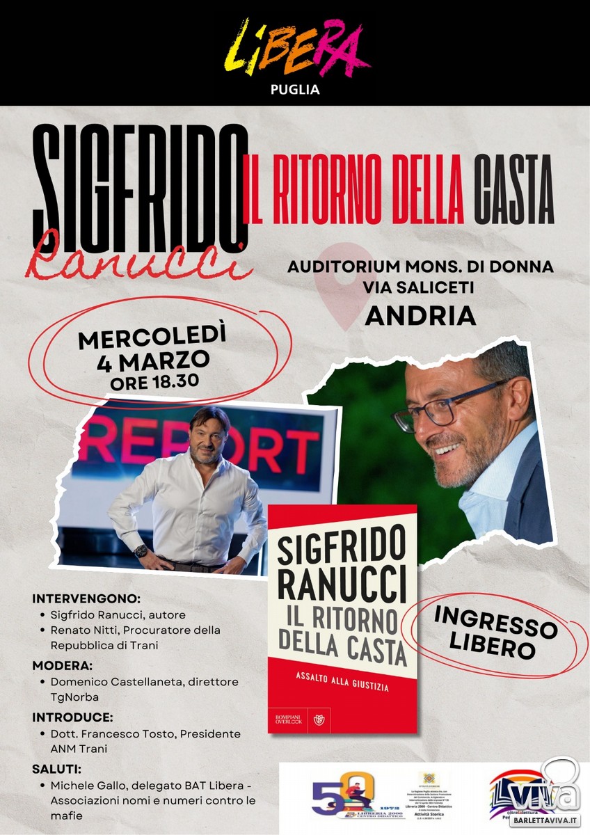 Mercoledì 4 marzo alle ore 18.30, presso l'Auditorium Mons. Di Donna in via Saliceti ad Andria, si terrà la presentazione del libro "Il ritorno della casta. Assalto alla giustizia" di Sigfrido Ranucci. L'incontro, promosso da Libera Puglia, sarà un'occasione di confronto sui temi della giustizia, della legalità e del ruolo dell'informazione. Oltre all'autore, interverrà Renato Nitti, Procuratore della Repubblica di Trani. A moderare sarà Domenico Castellaneta, direttore di TGNorba.
